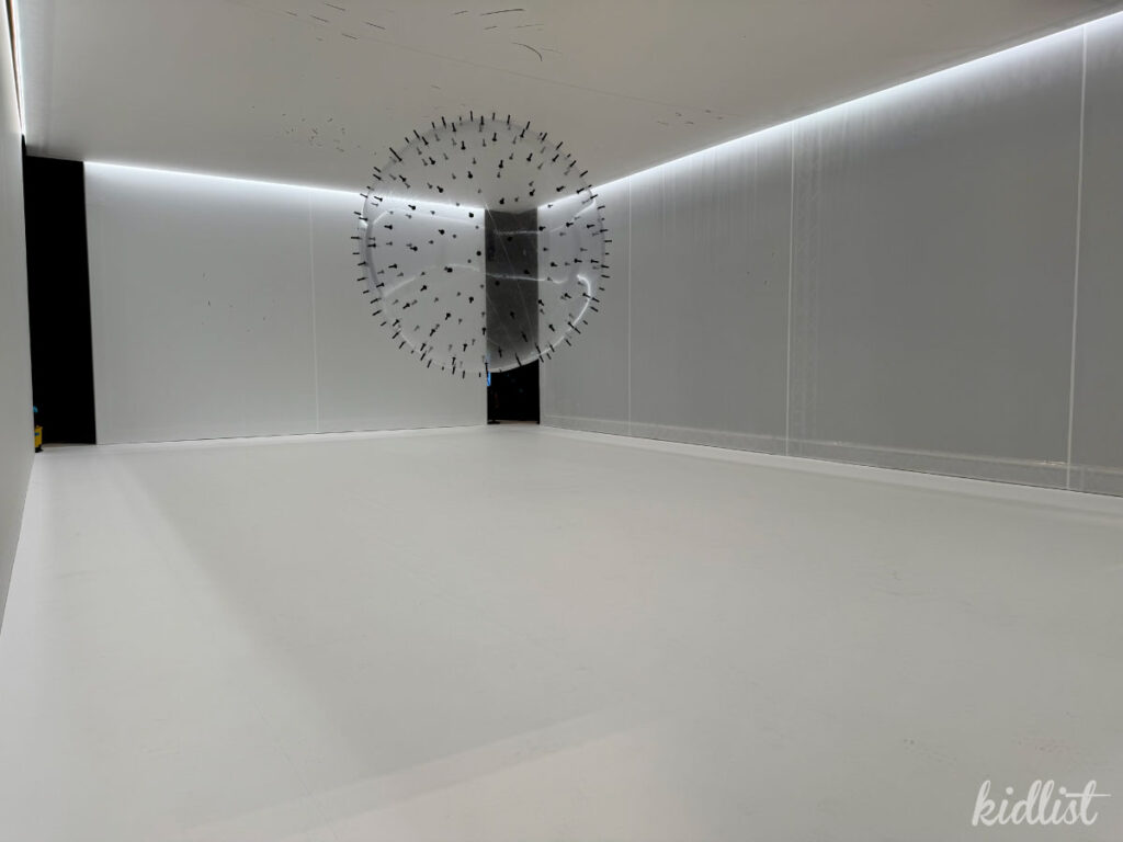 ADA features a massive white ball covered in charcoal sticks that invites visitors to push and spin the sphere to leave bold black marks across white walls, ceiling, and floor. Kids will love that they’re literally helping create the art. Jondra and I were invited to the media preview, so you can see the blank slate below, but we’re eager to see what it looks like after everyone leaves their mark!