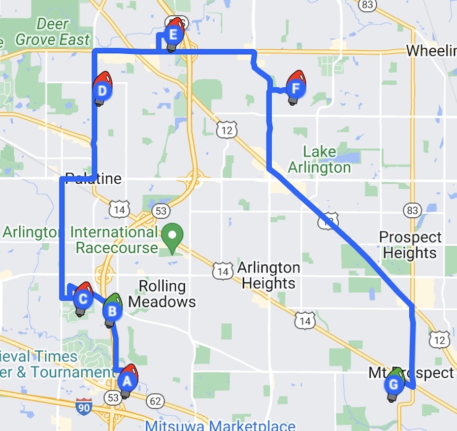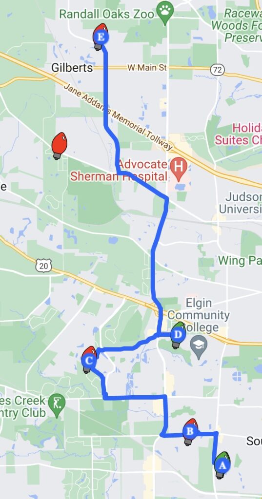 We prepared routes for you so you can take lights tours of different areas across the Chicago suburbs! We encourage you to keep this guide open on your phone and tap on the next address heading – your map app will open to take you to the next decorated house. They are all in order to maximize your enjoyment and minimize driving time.