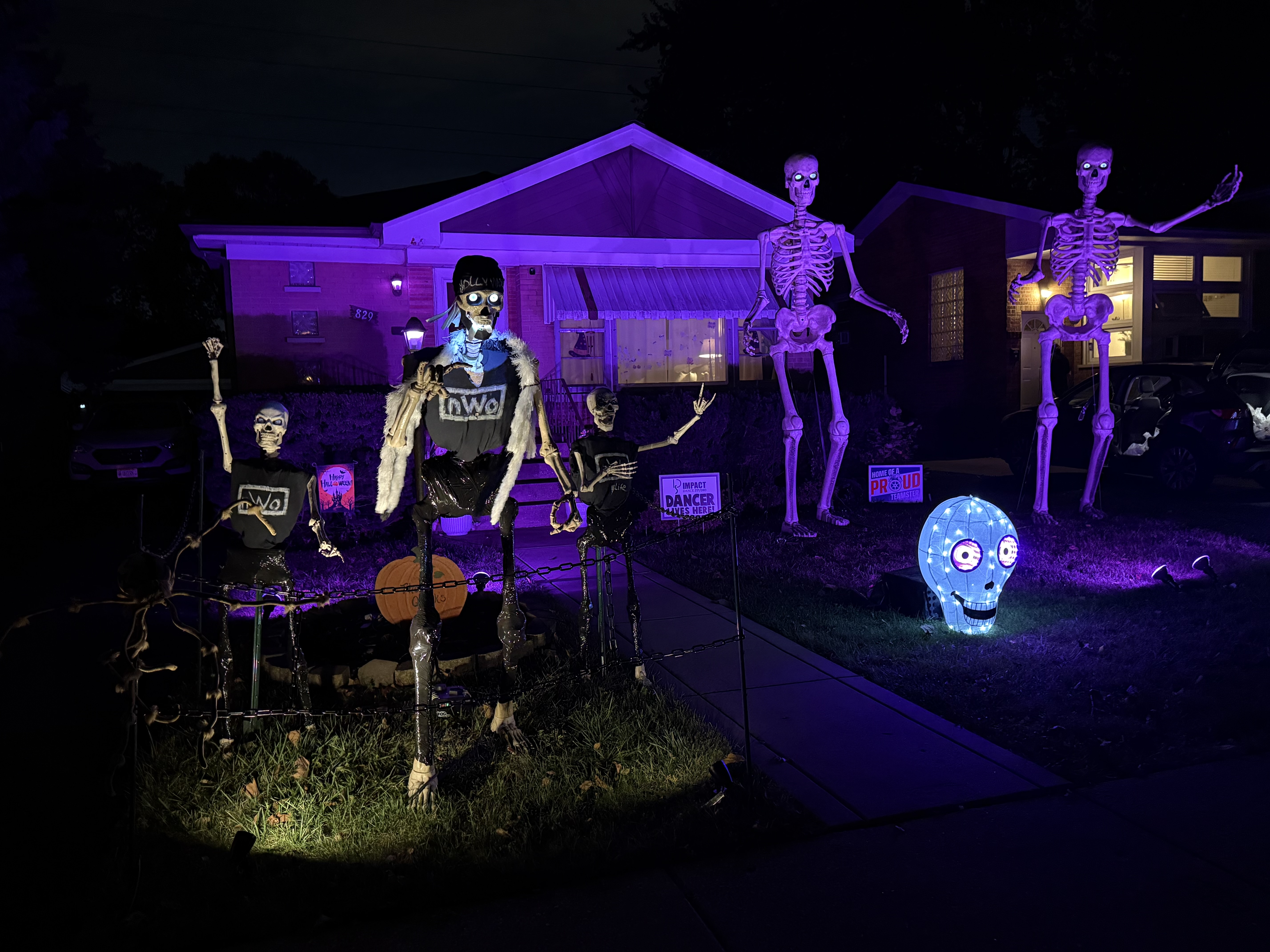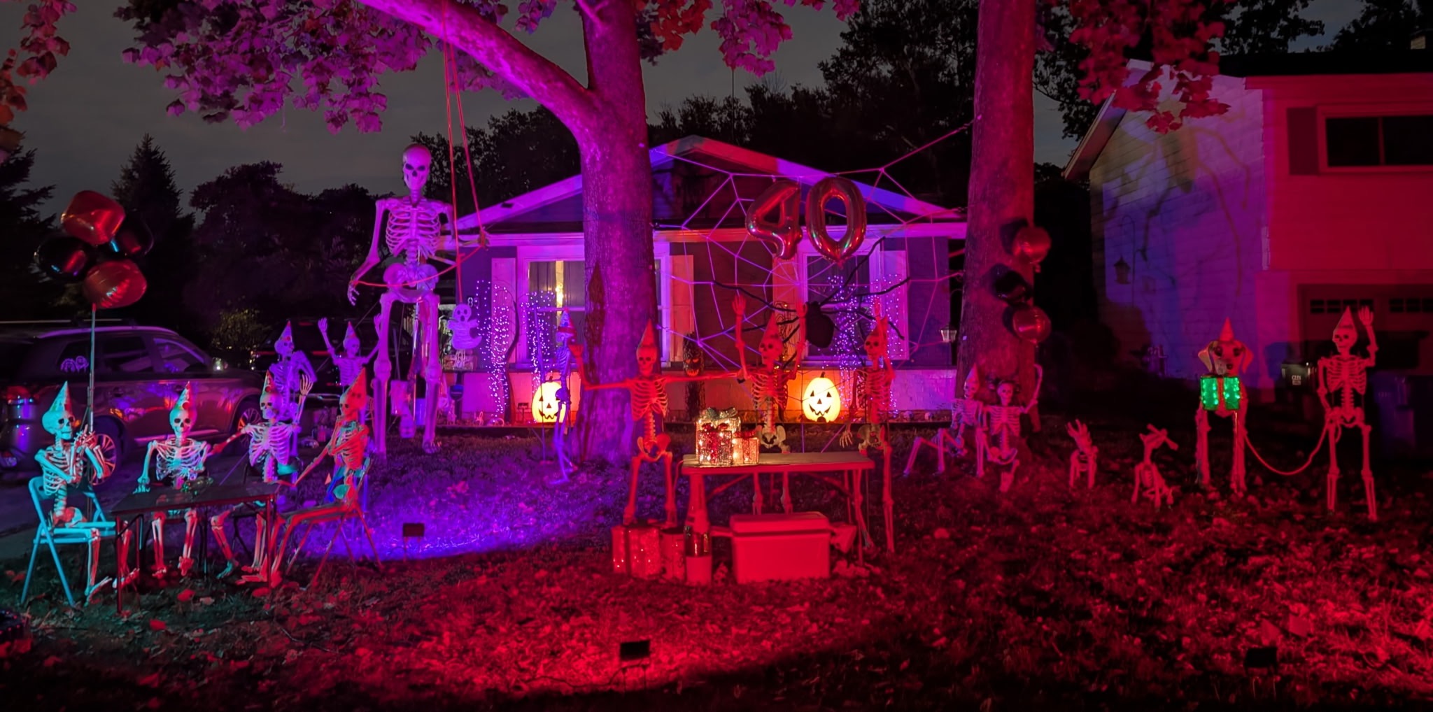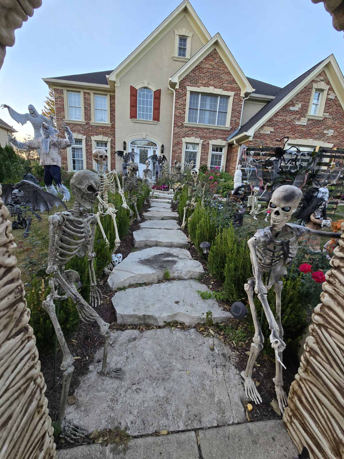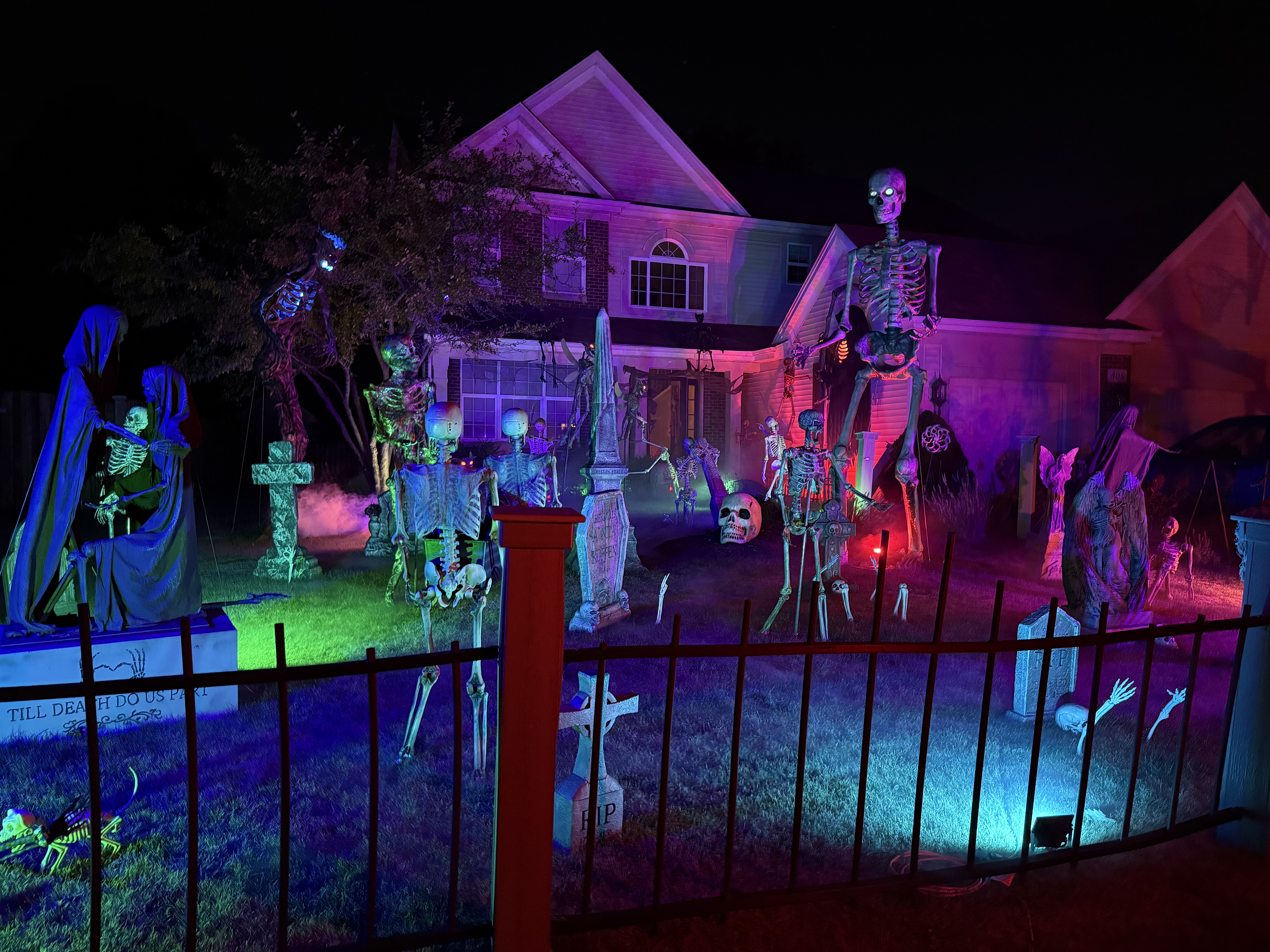 From 2024: 5 large skeletons, 3 skeleton dogs, creepy spiders crawling on the house, and a projector with singing skeletons.