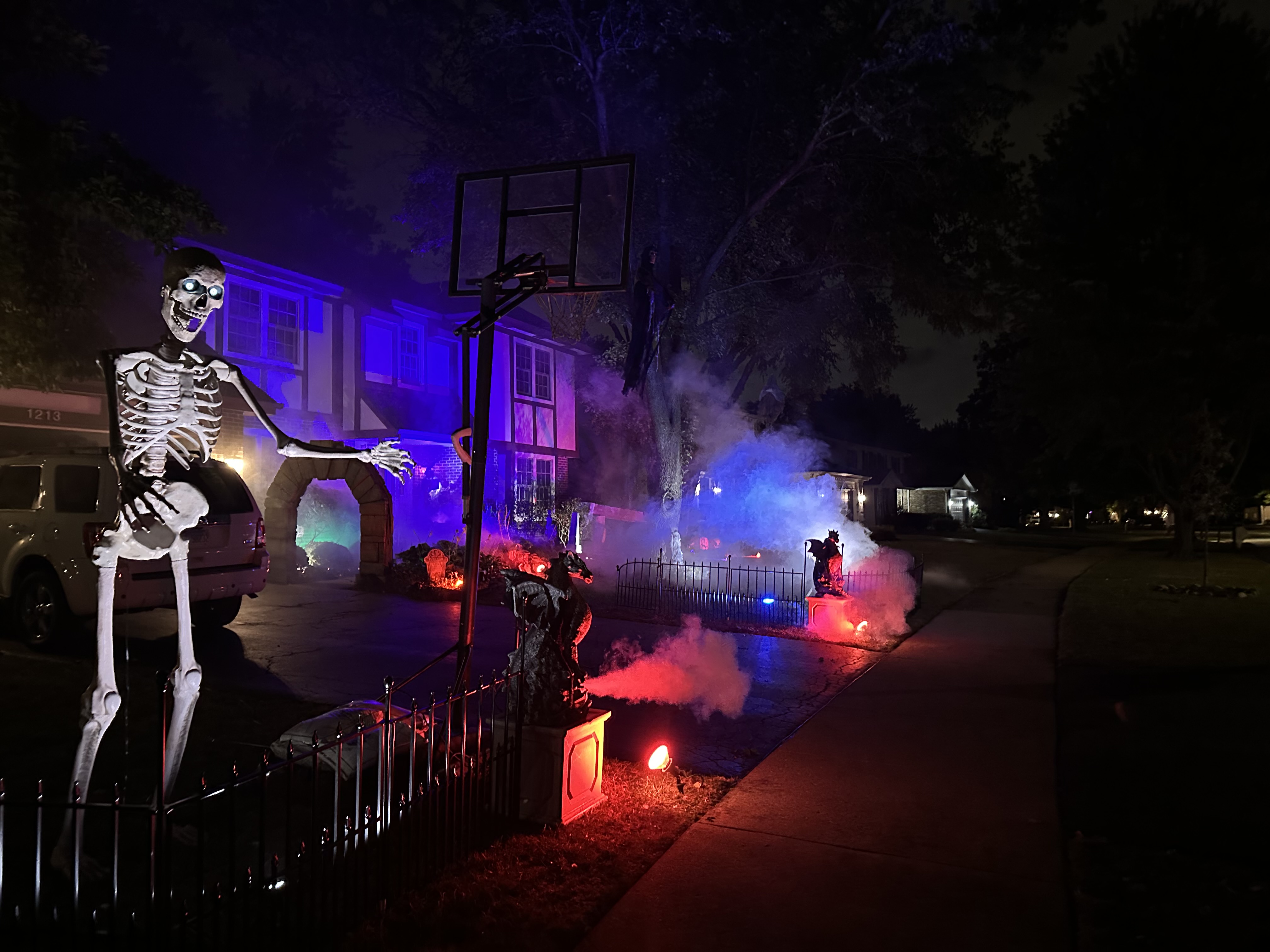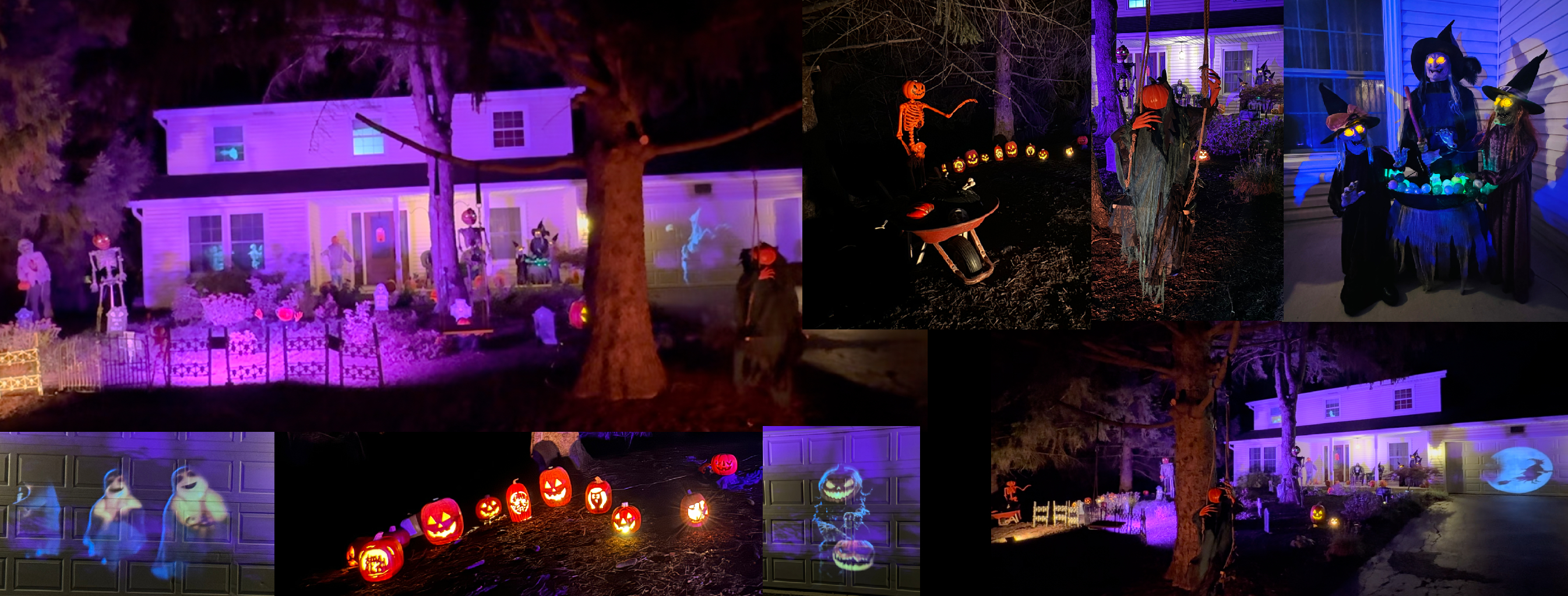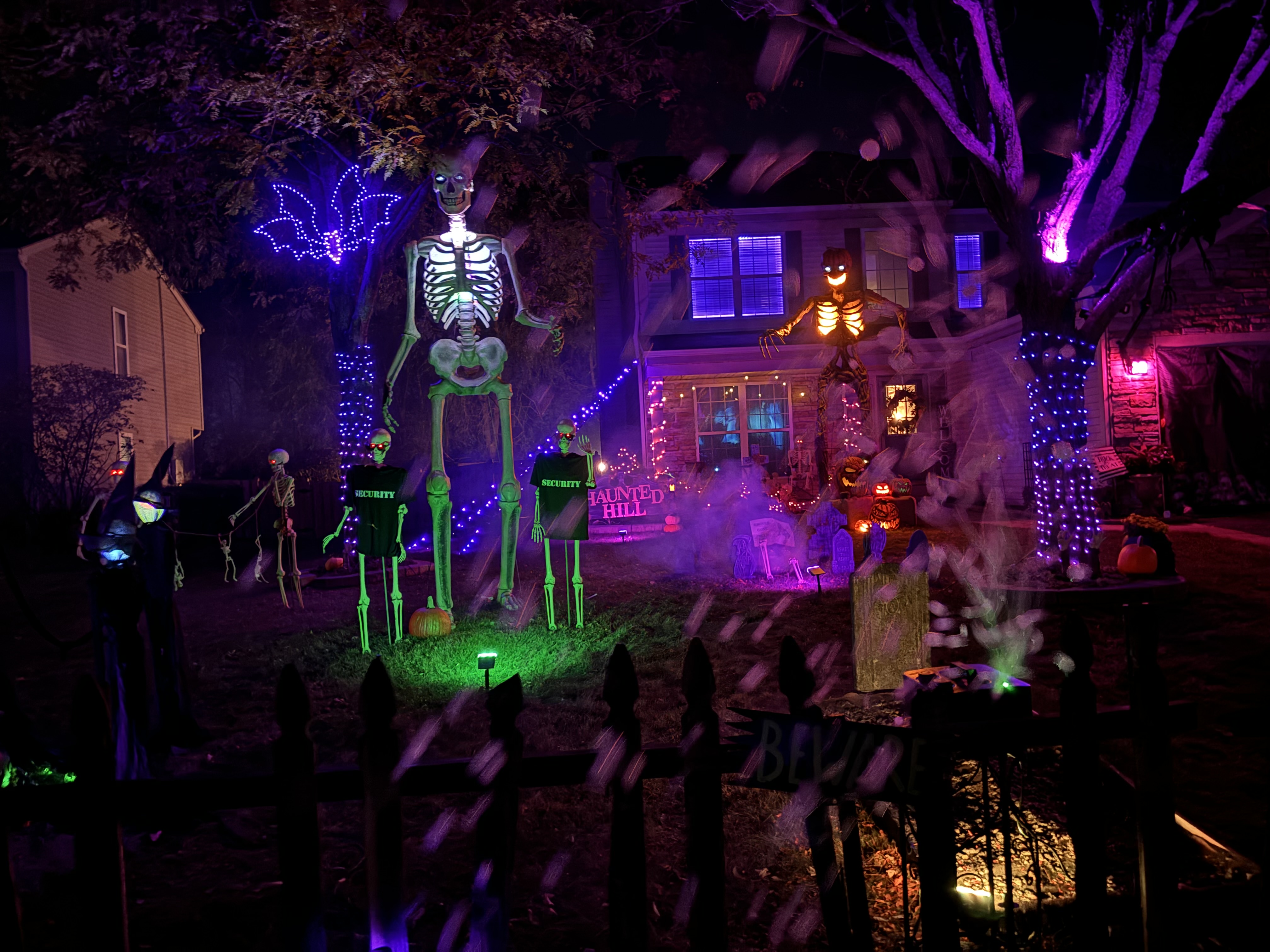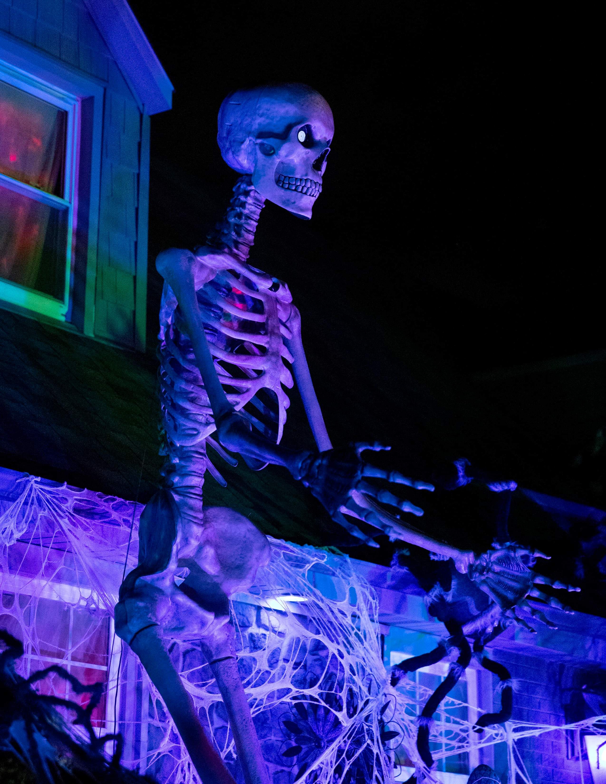 From 2024: 5 large skeletons, 3 skeleton dogs, creepy spiders crawling on the house, and a projector with singing skeletons.