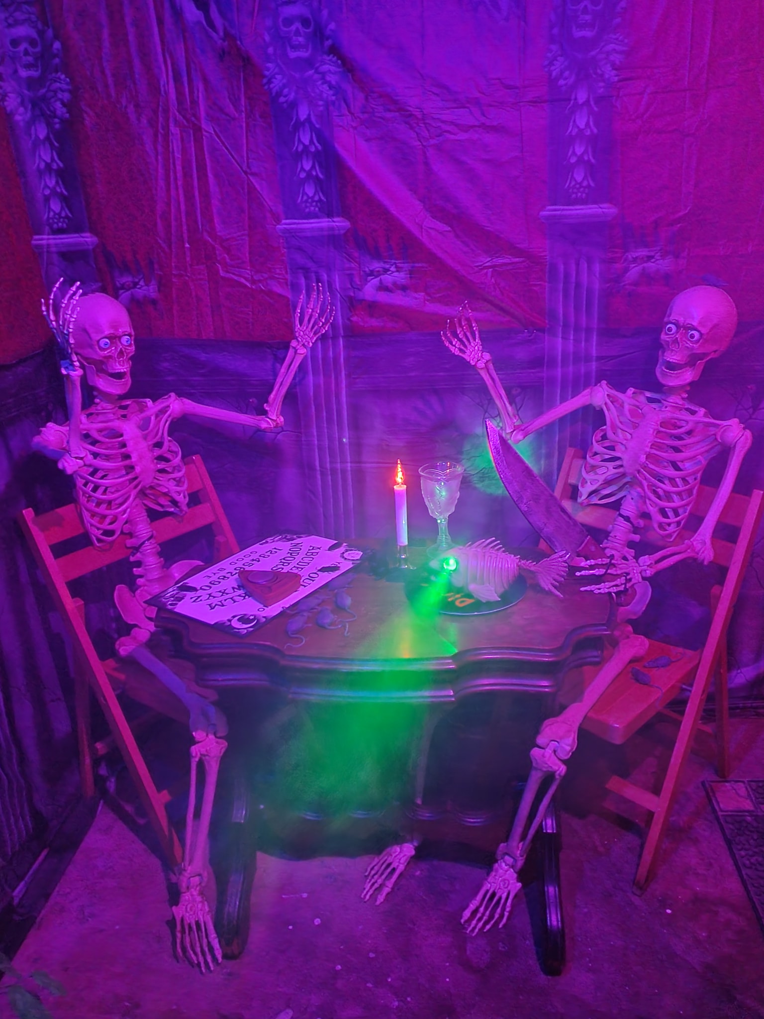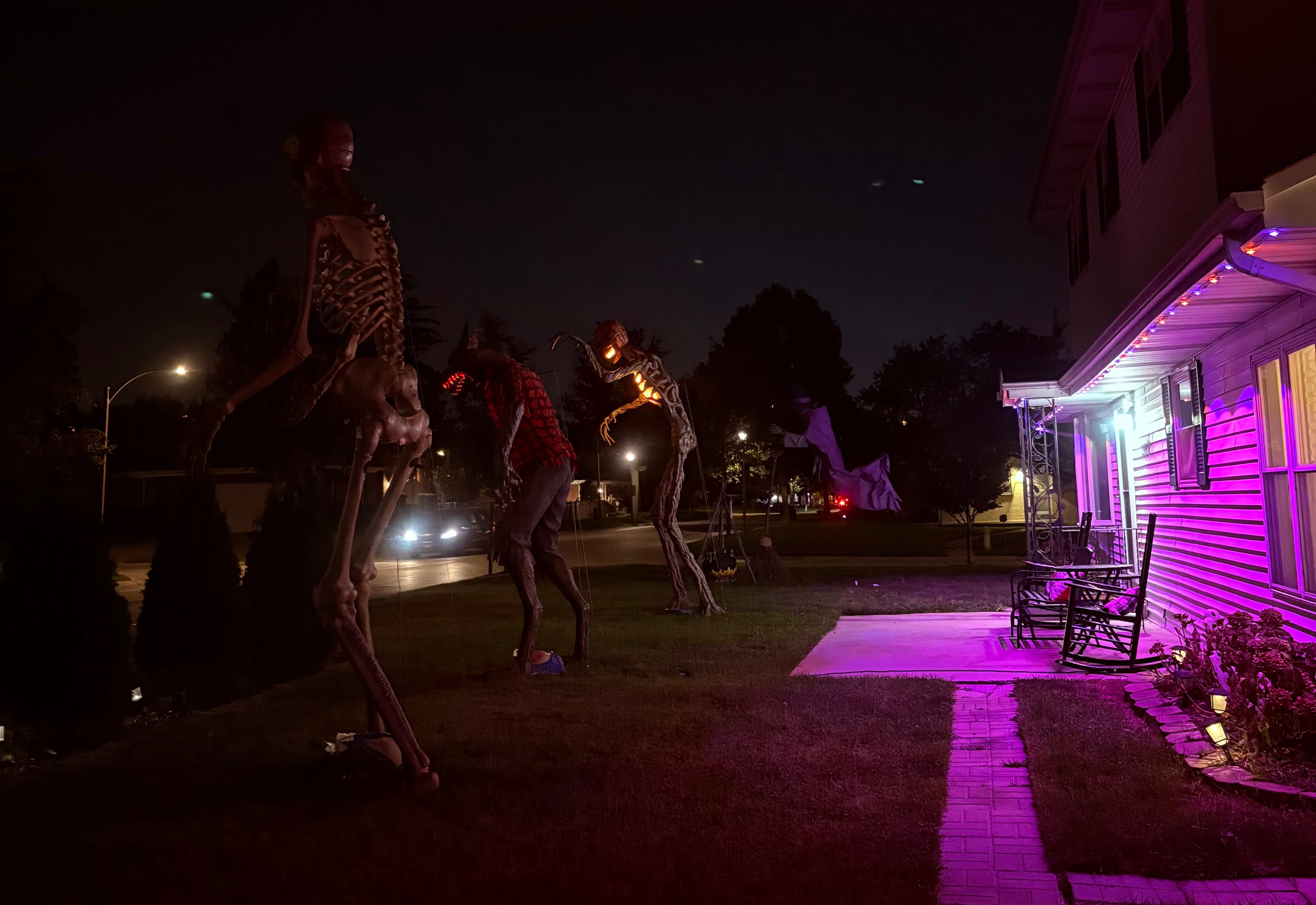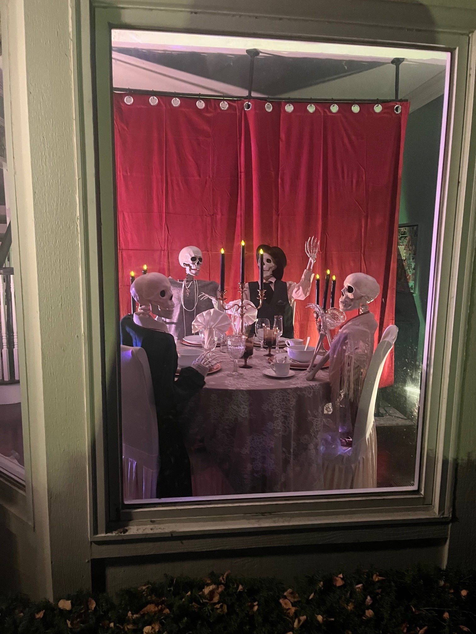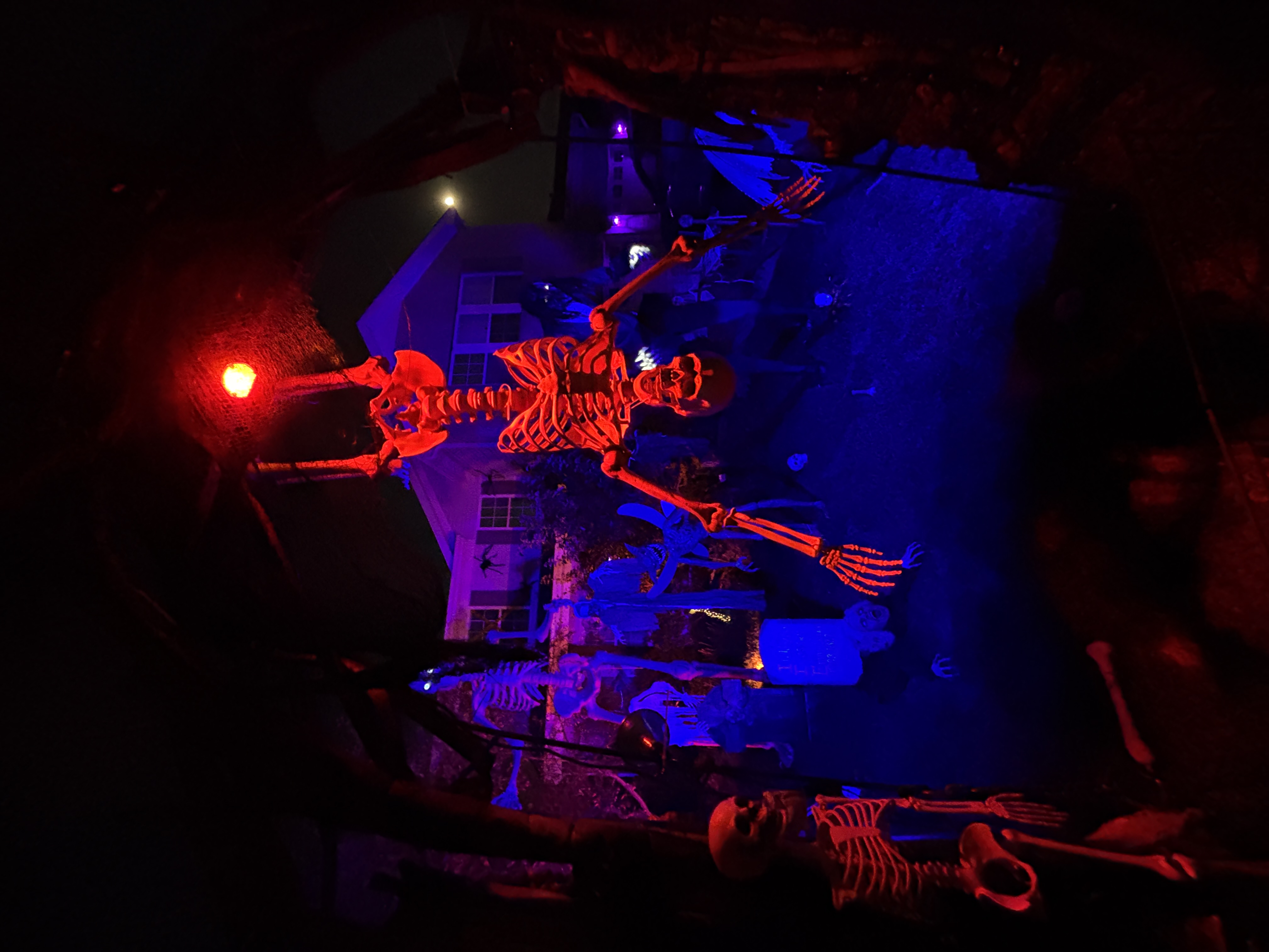 From 2024: 5 large skeletons, 3 skeleton dogs, creepy spiders crawling on the house, and a projector with singing skeletons.