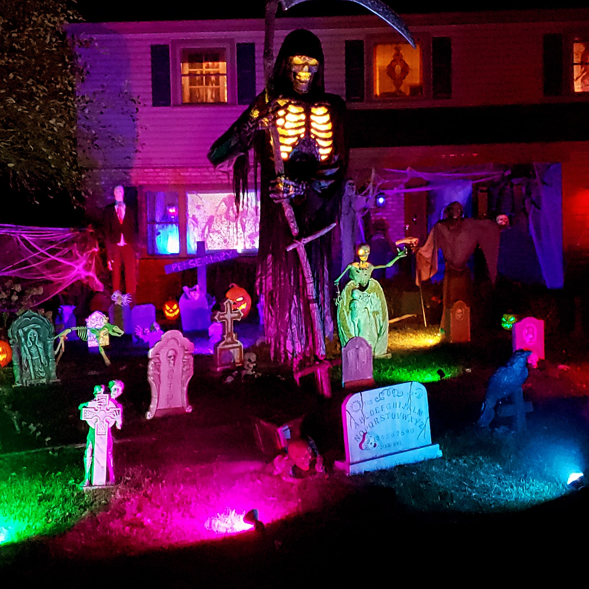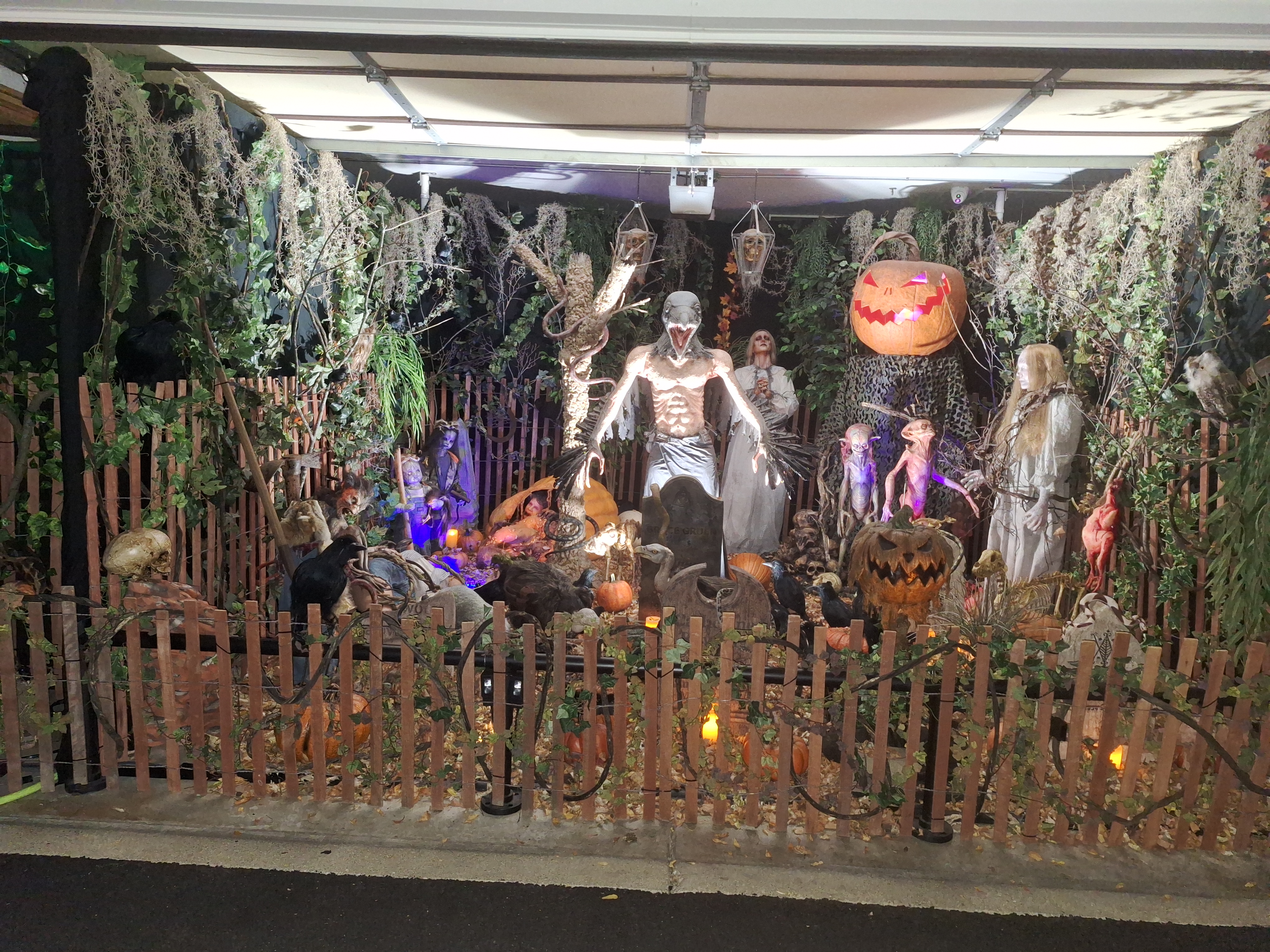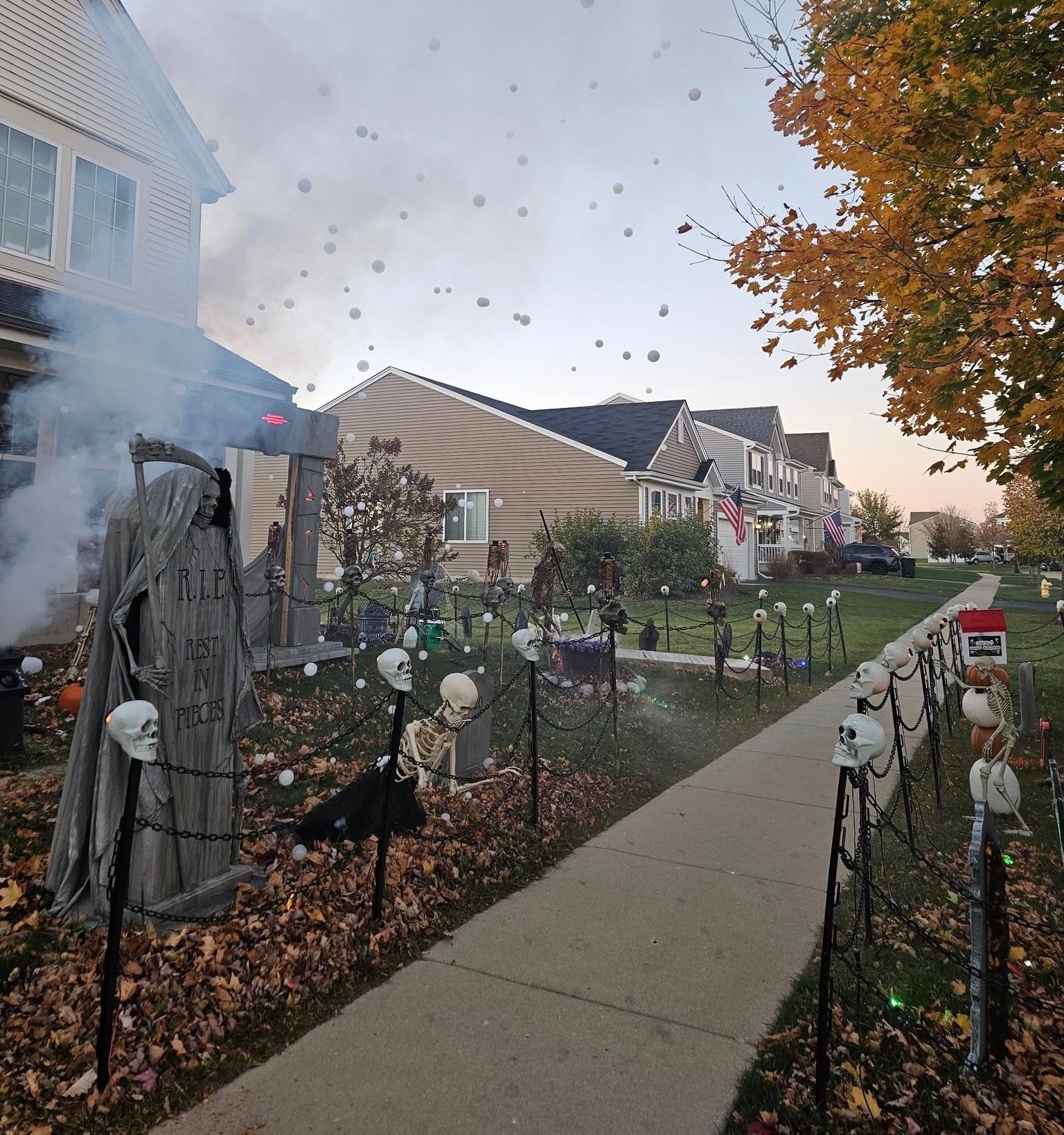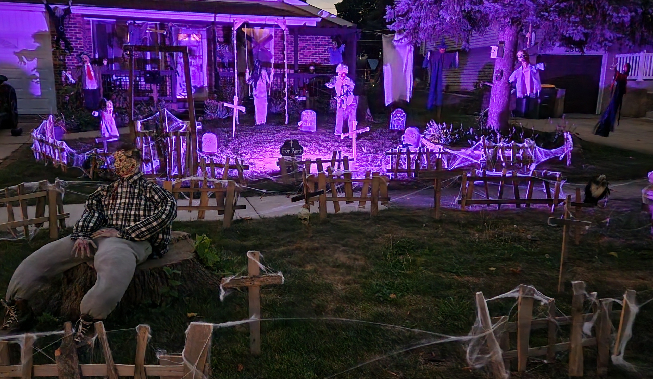 Front yard walkthrough with static and animatronic prop display. Weekends will have fog and music. Littles who may be afraid are welcome during daylight when everything is off.