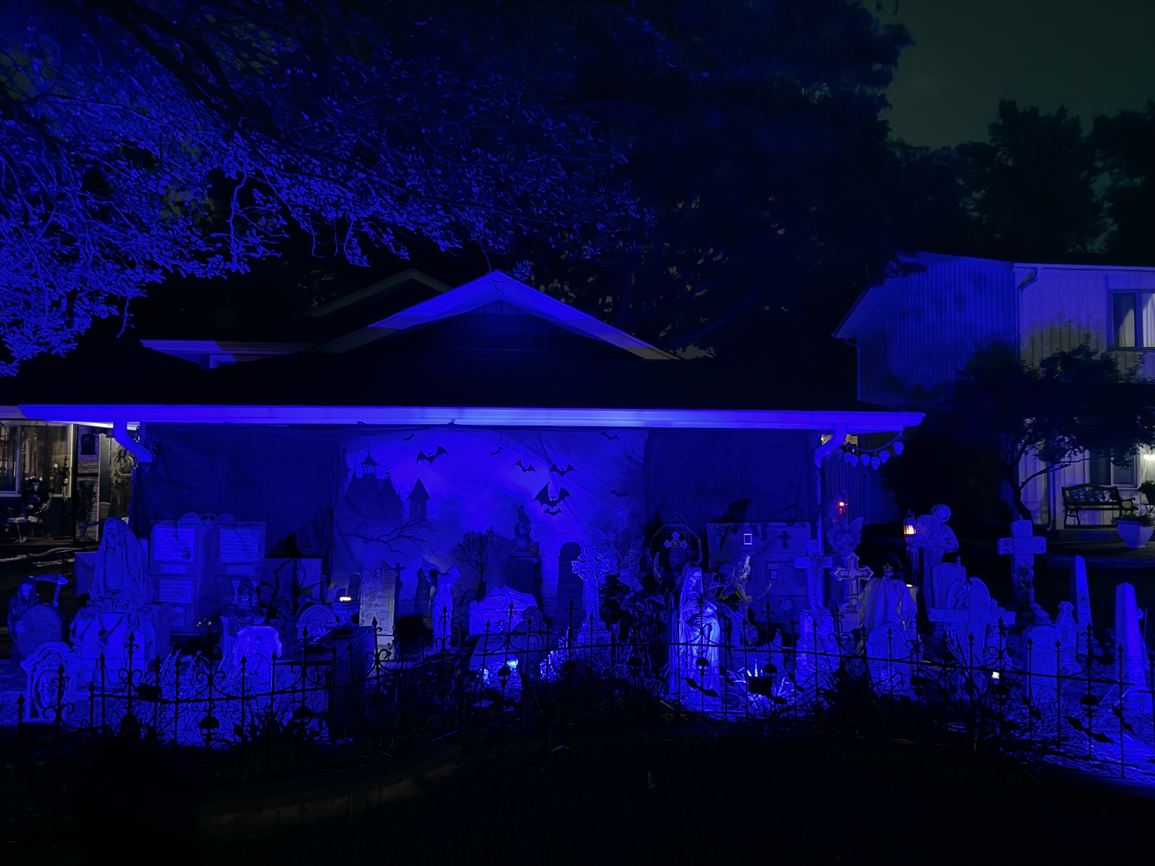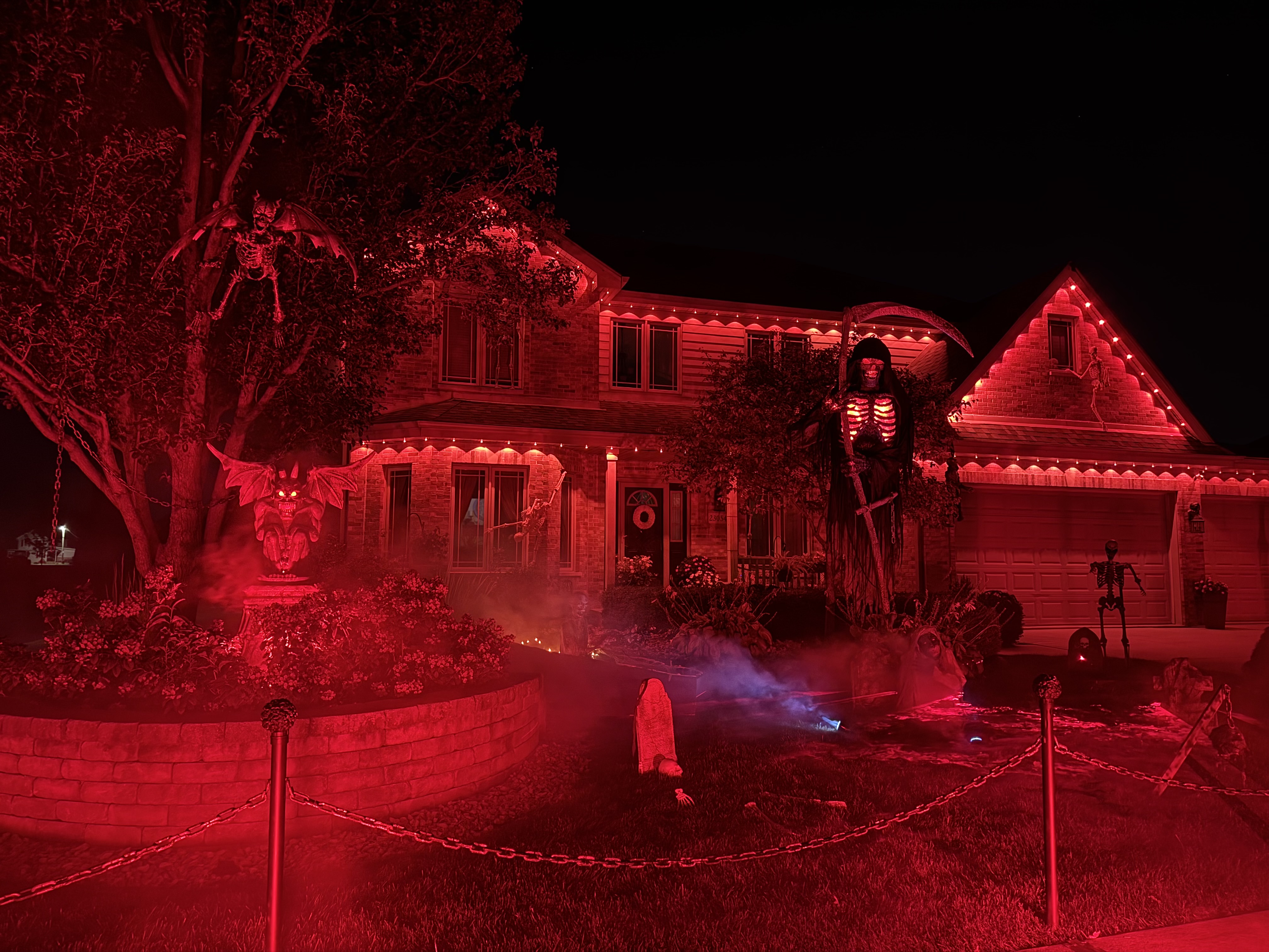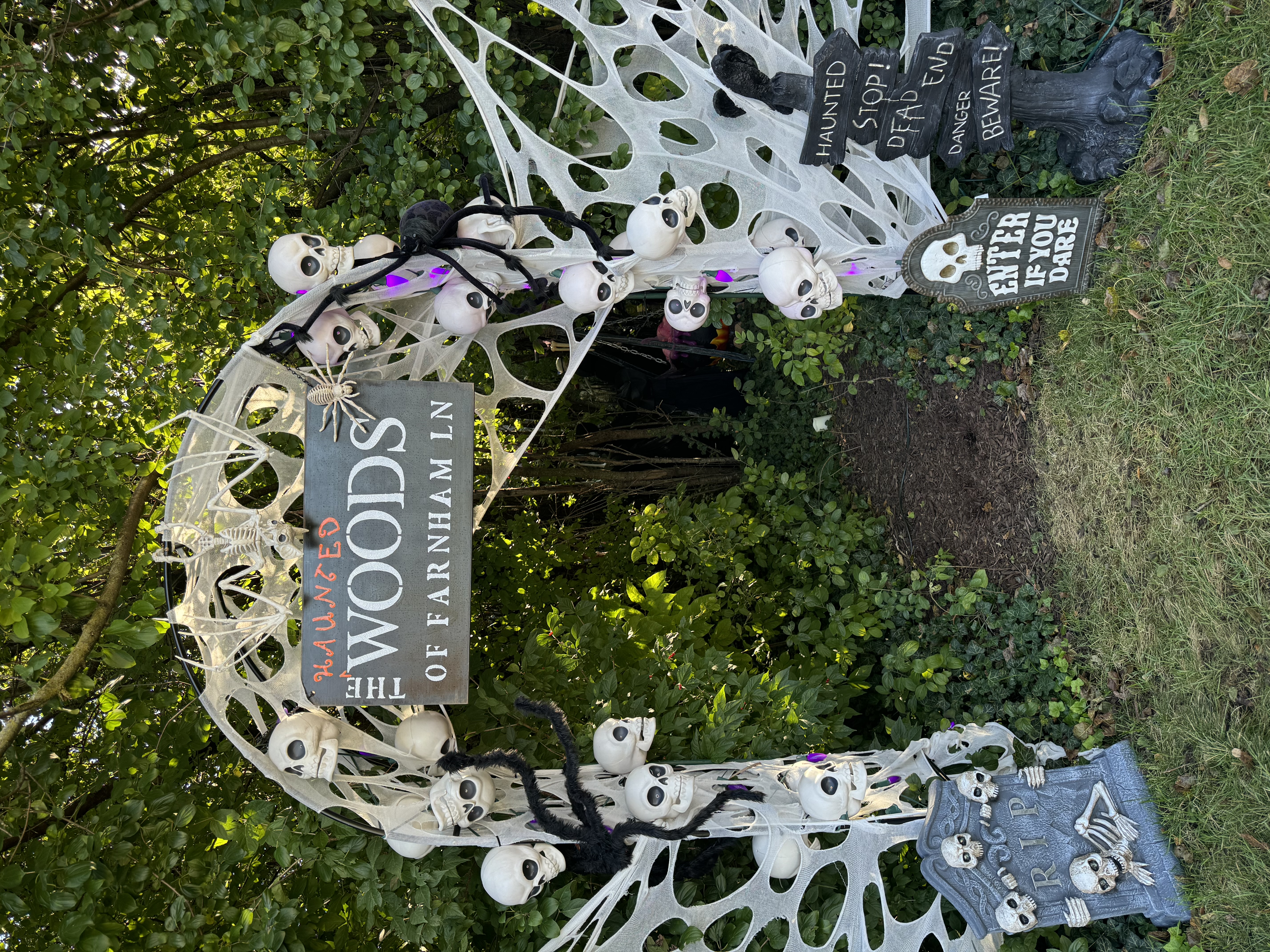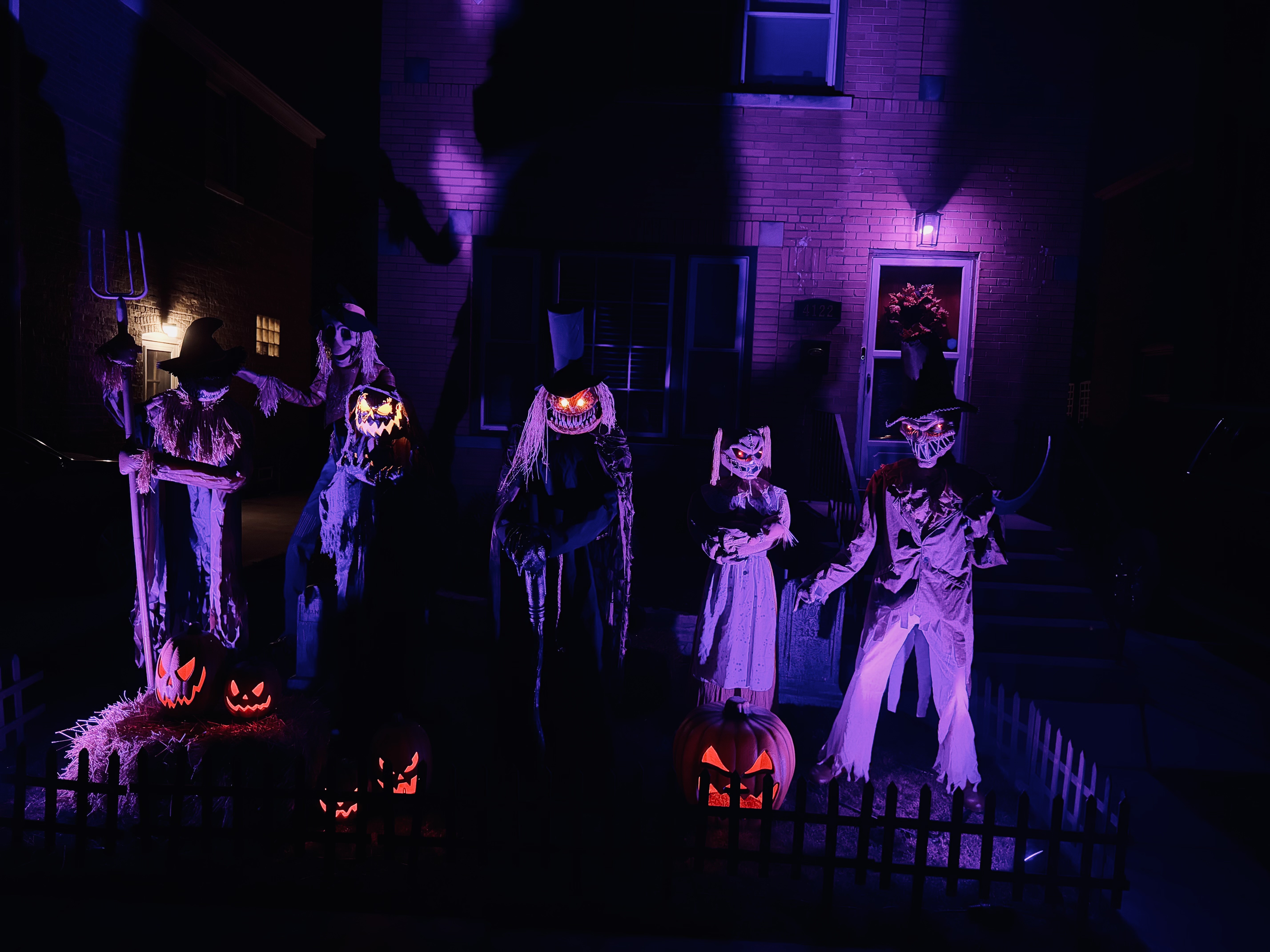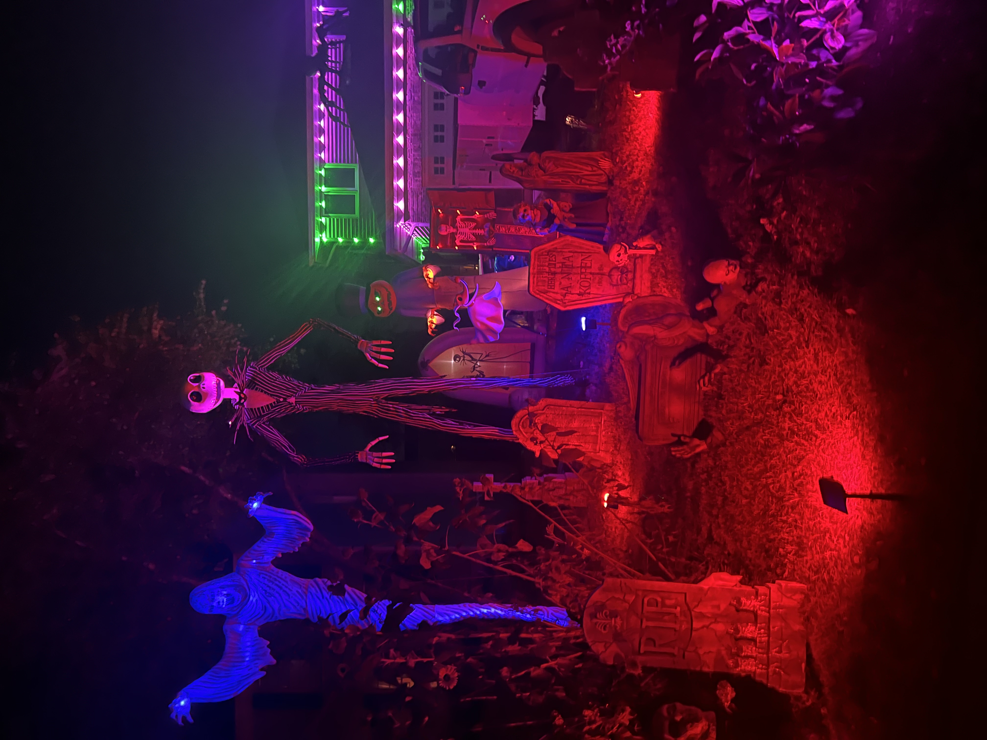 Front yard walkthrough with static and animatronic prop display. Weekends will have fog and music. Littles who may be afraid are welcome during daylight when everything is off.