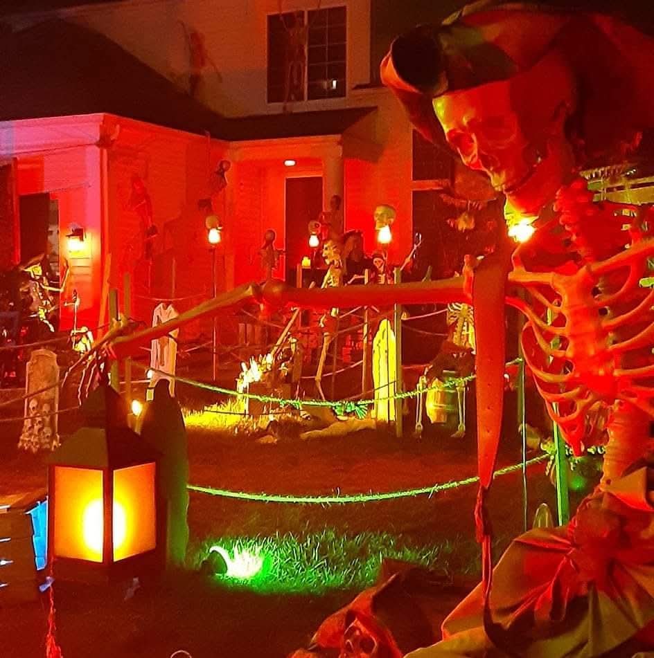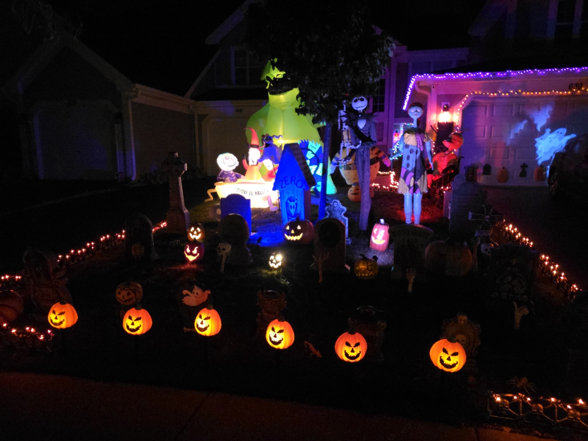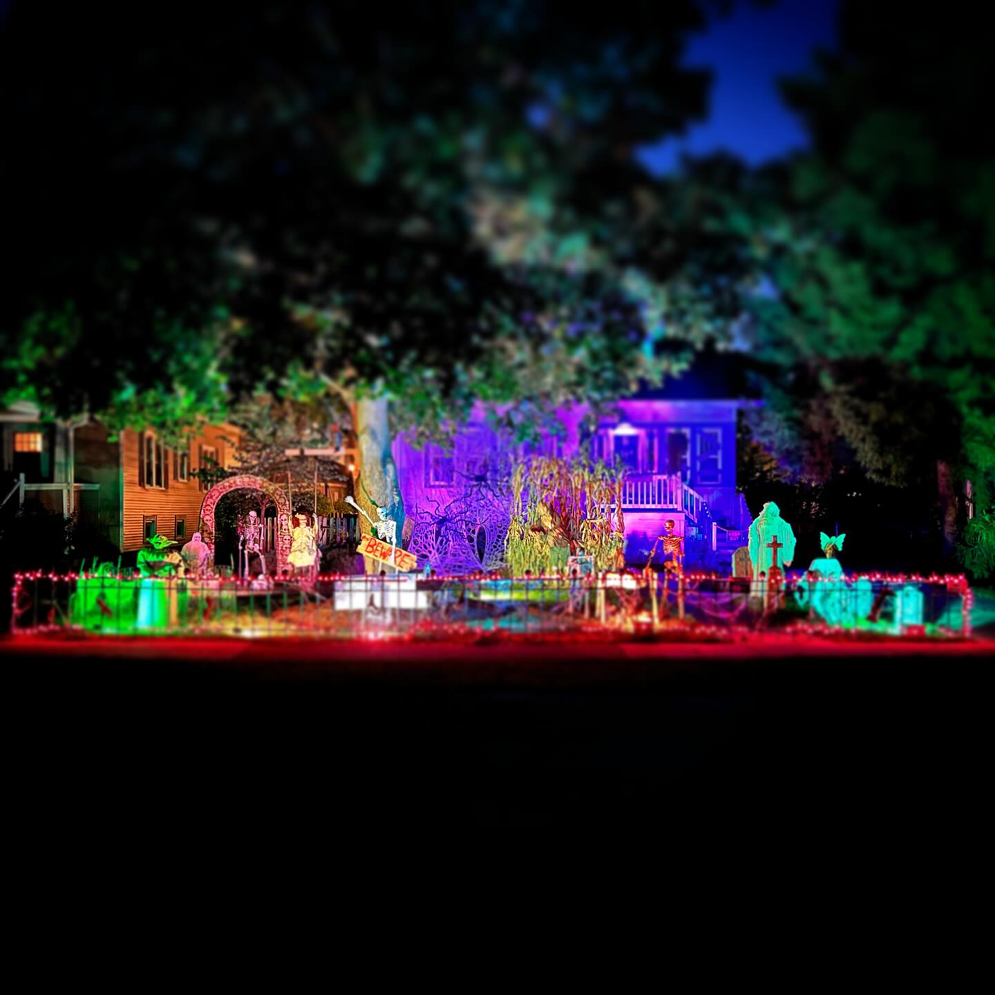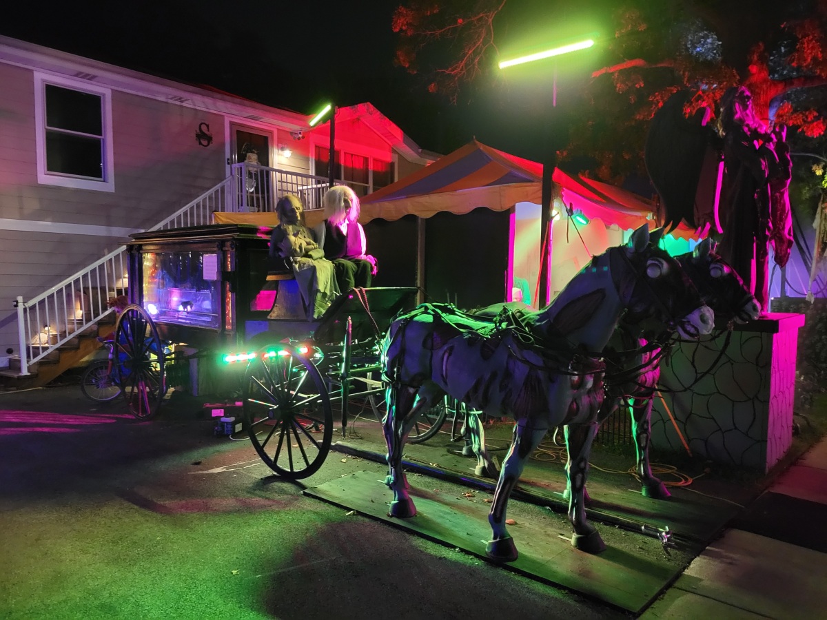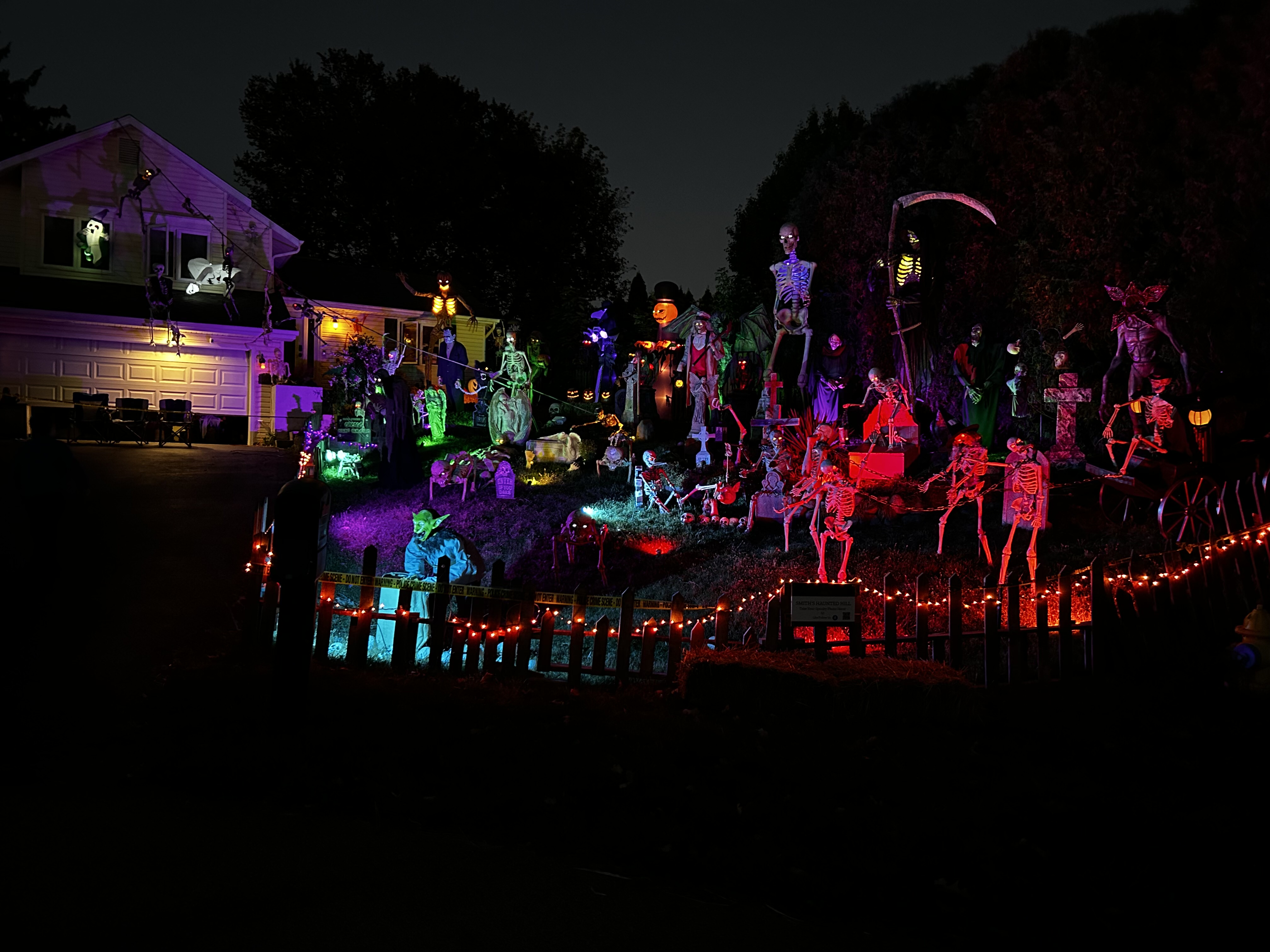 This family-friendly display is down the street from the Stranger Things display and has great scenes with pumpkins, skeletons, and fog. They are so talented, they help create props for other displays as well!
