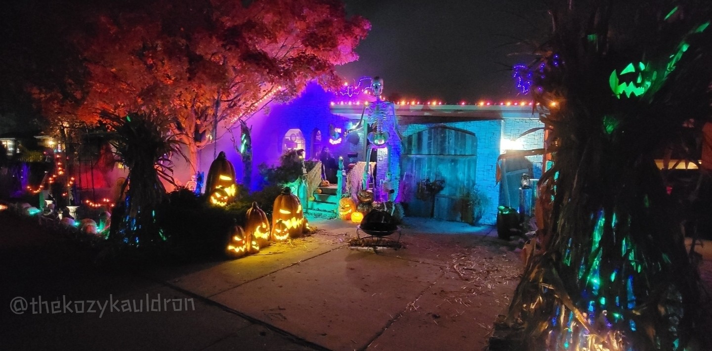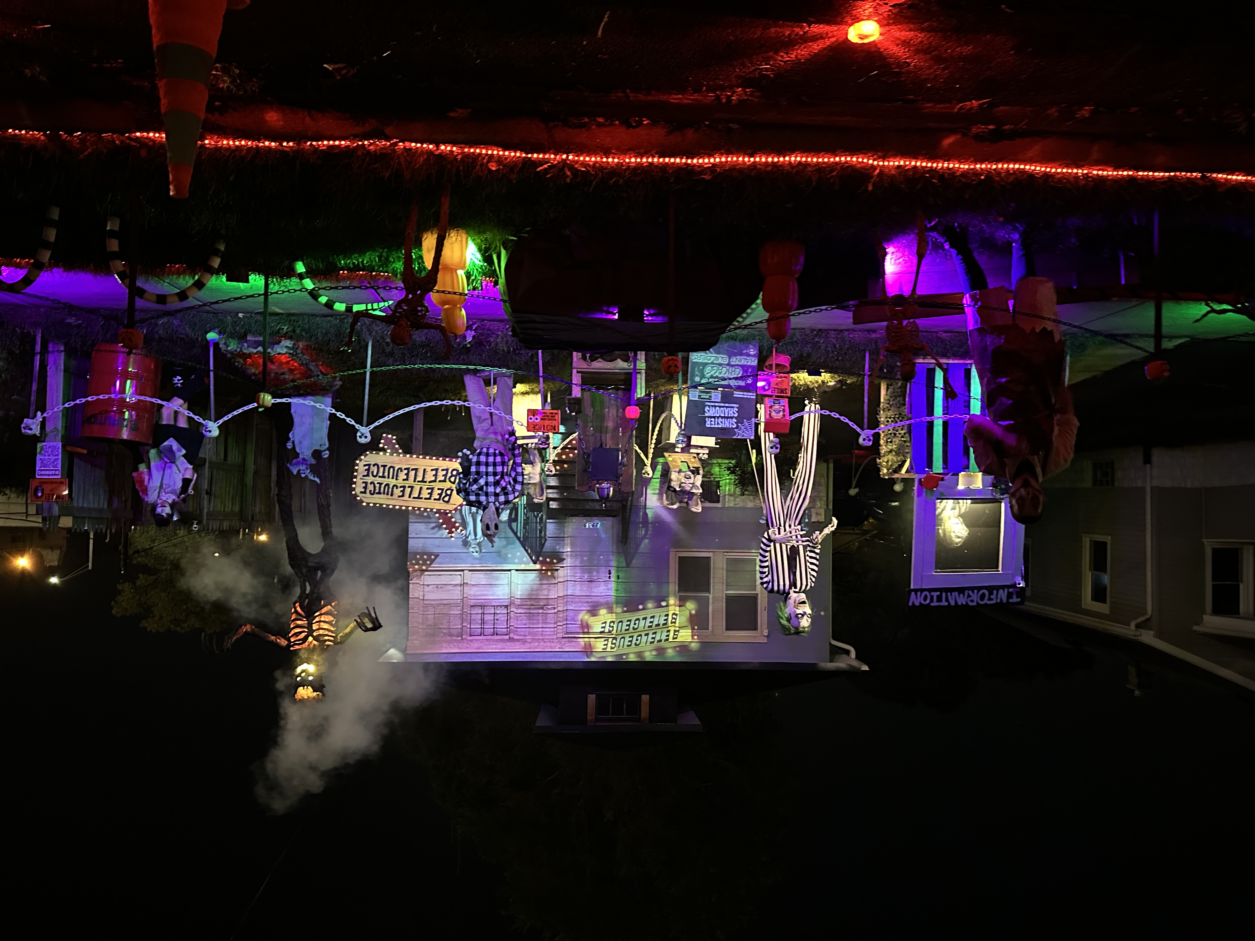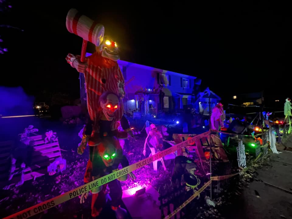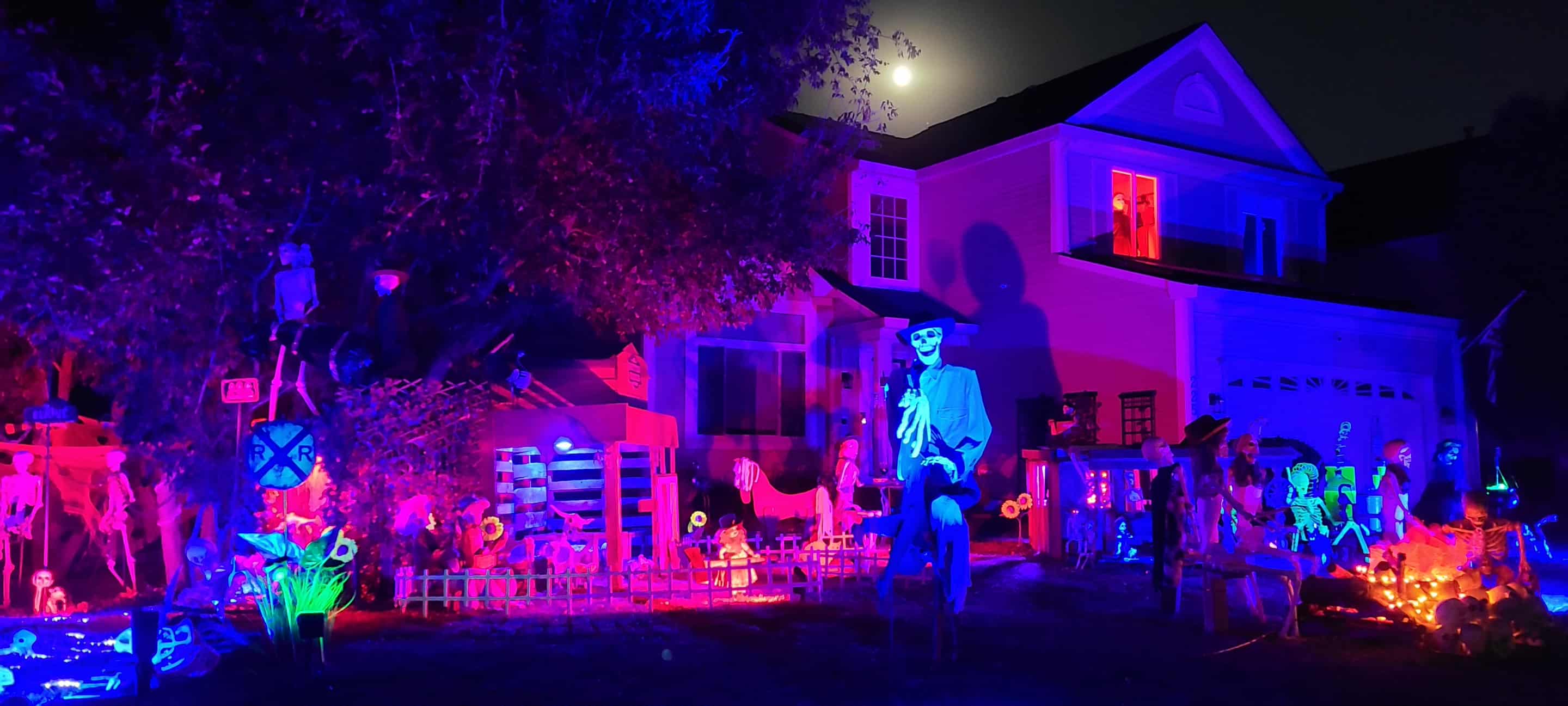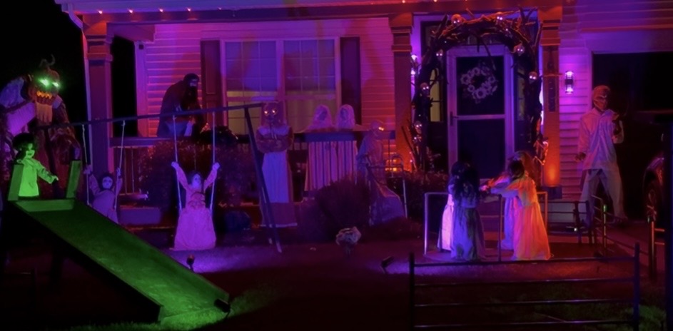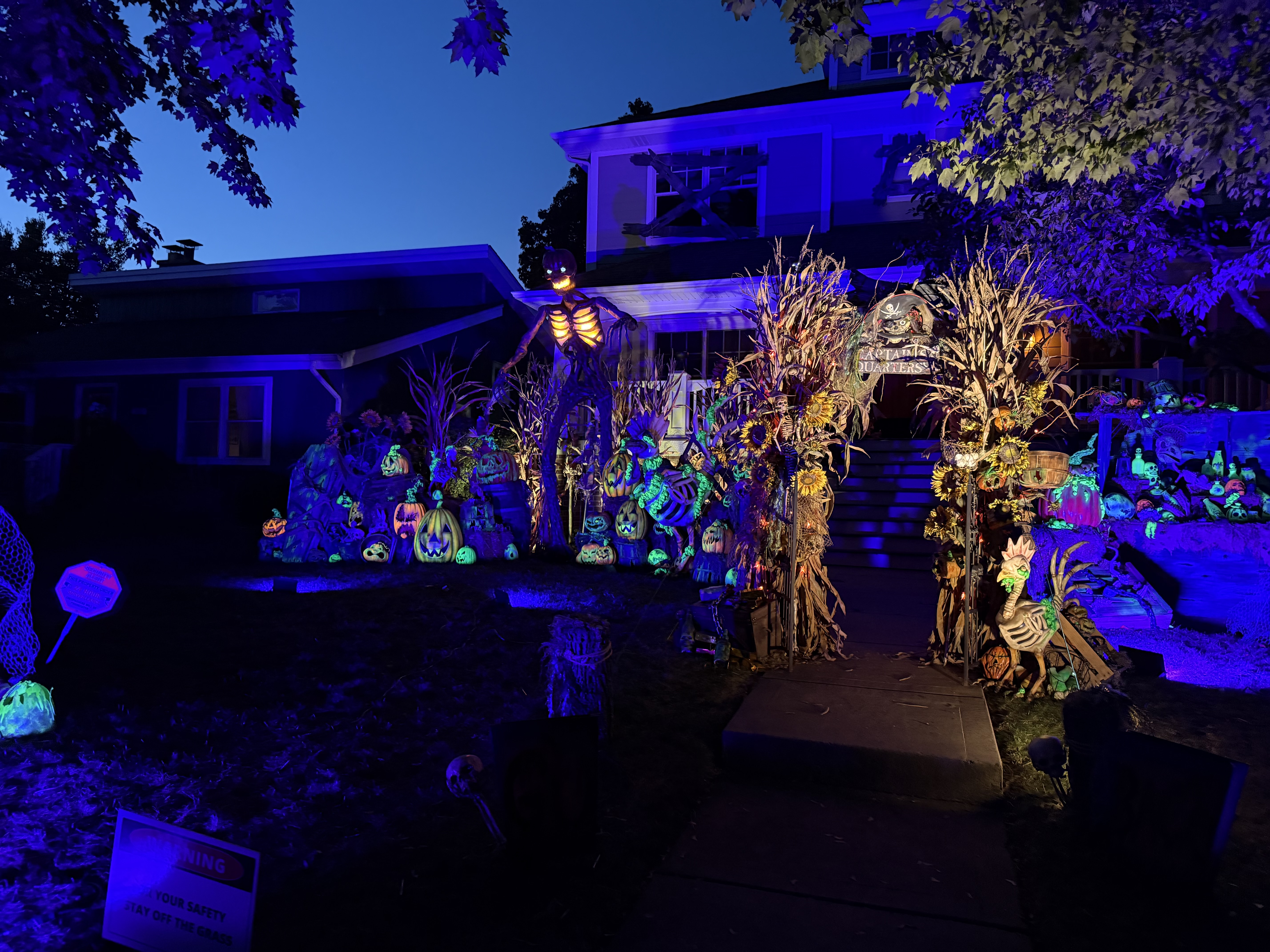 This family-friendly display is down the street from the Stranger Things display and has great scenes with pumpkins, skeletons, and fog. They are so talented, they help create props for other displays as well!