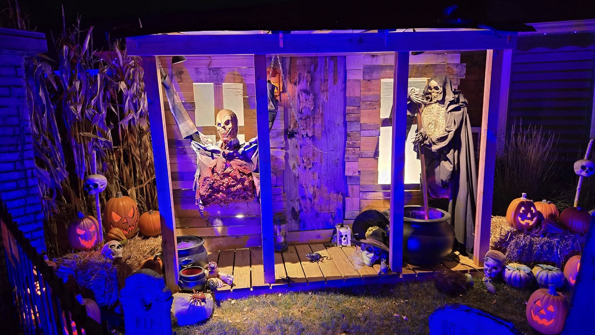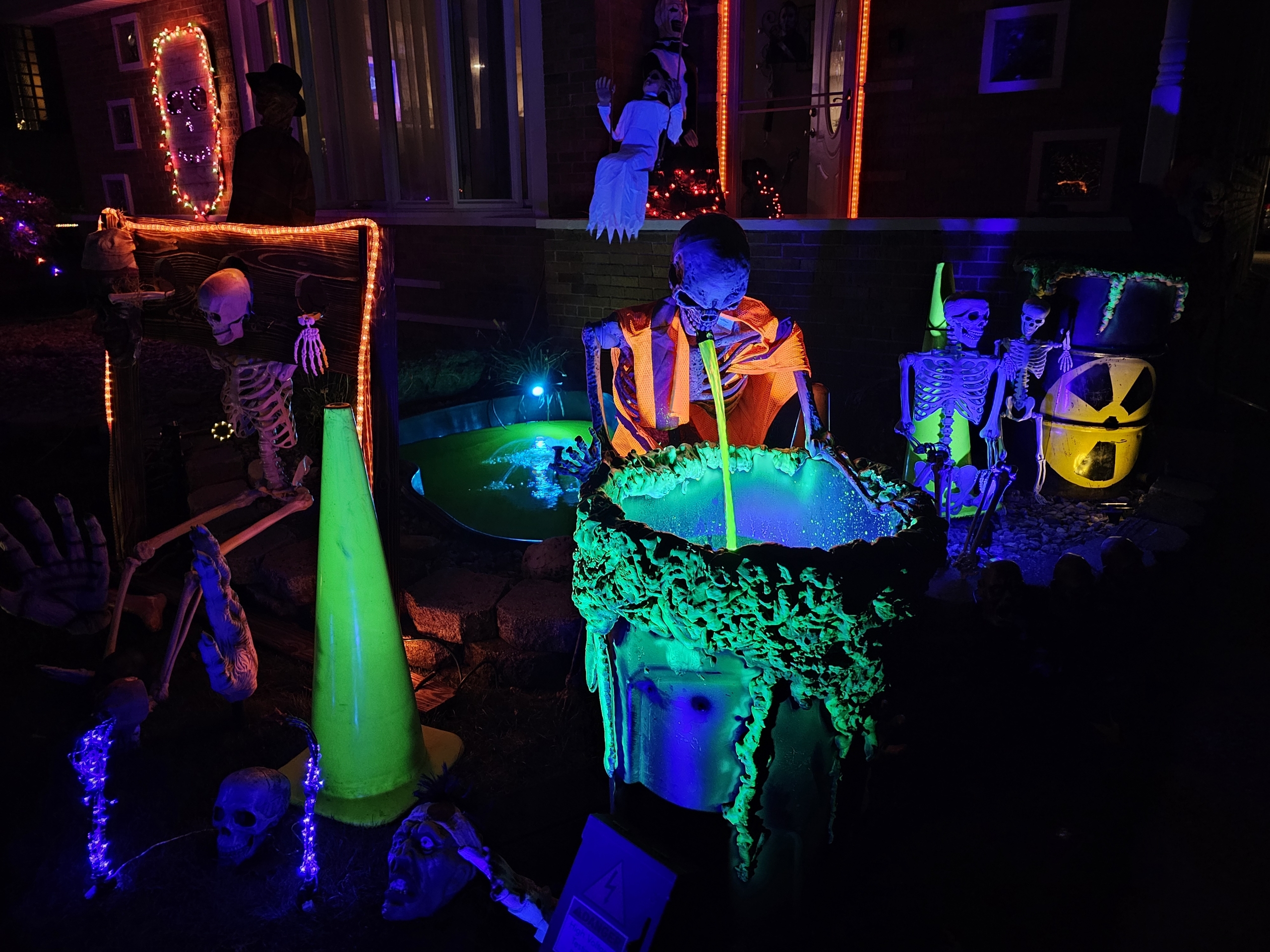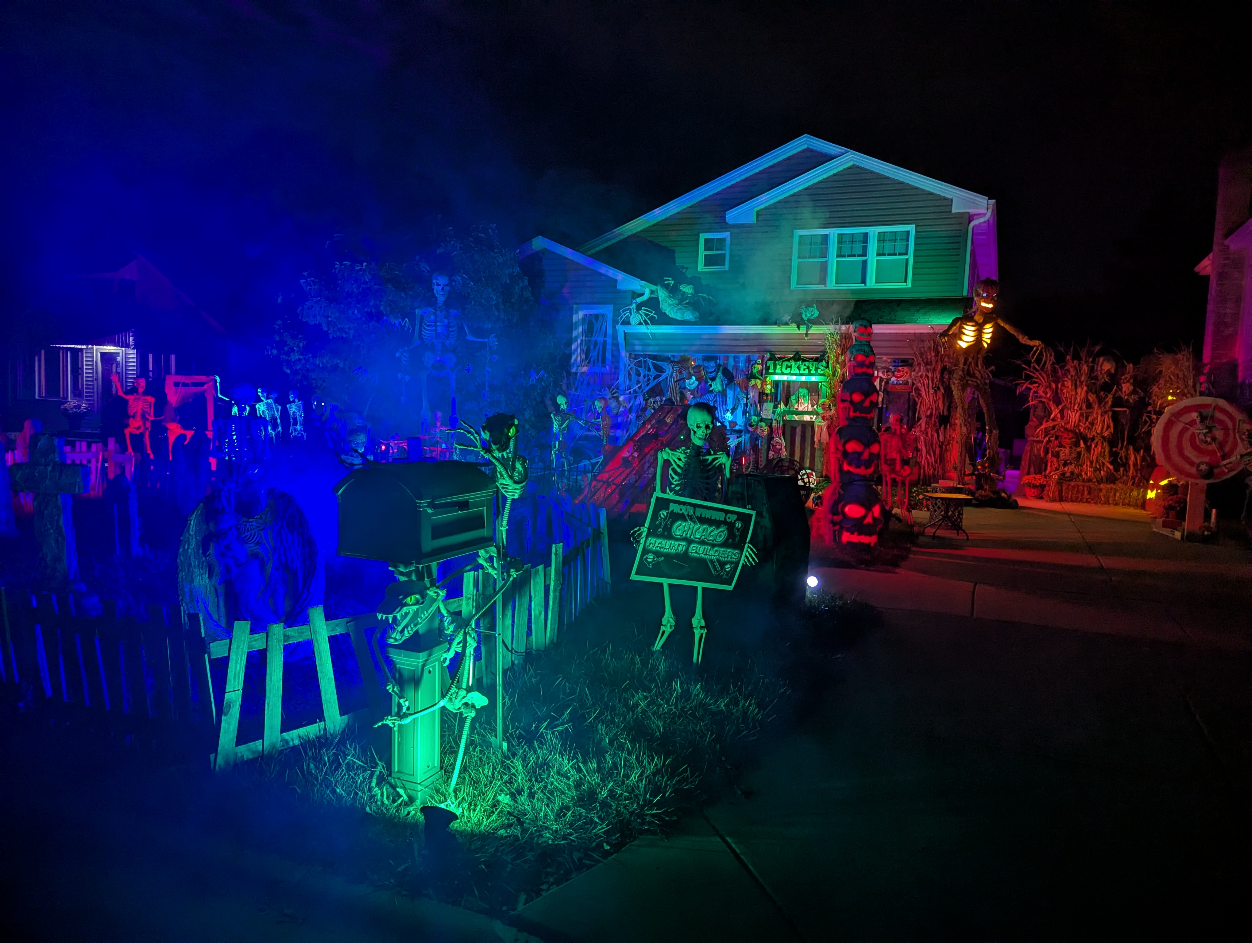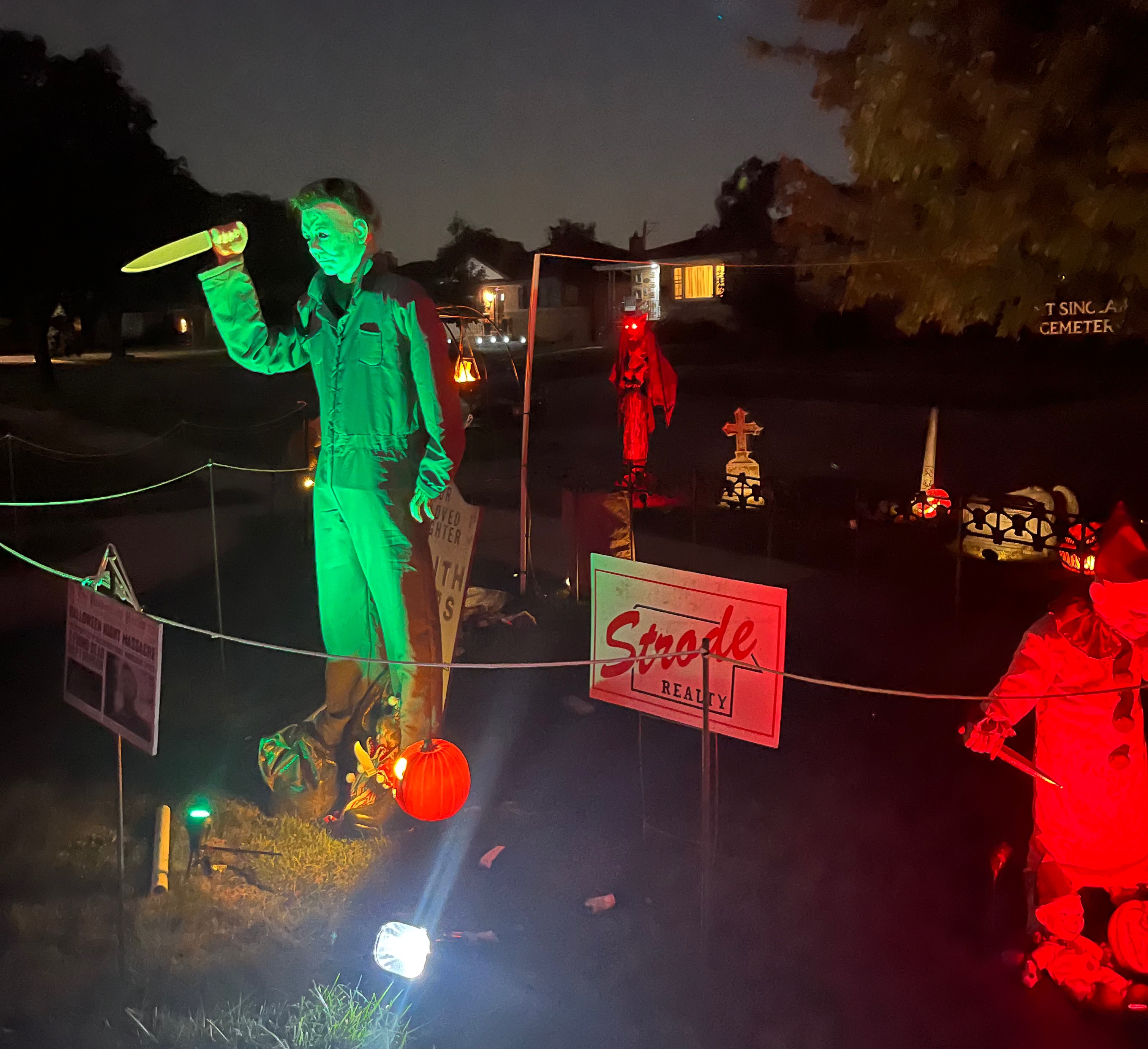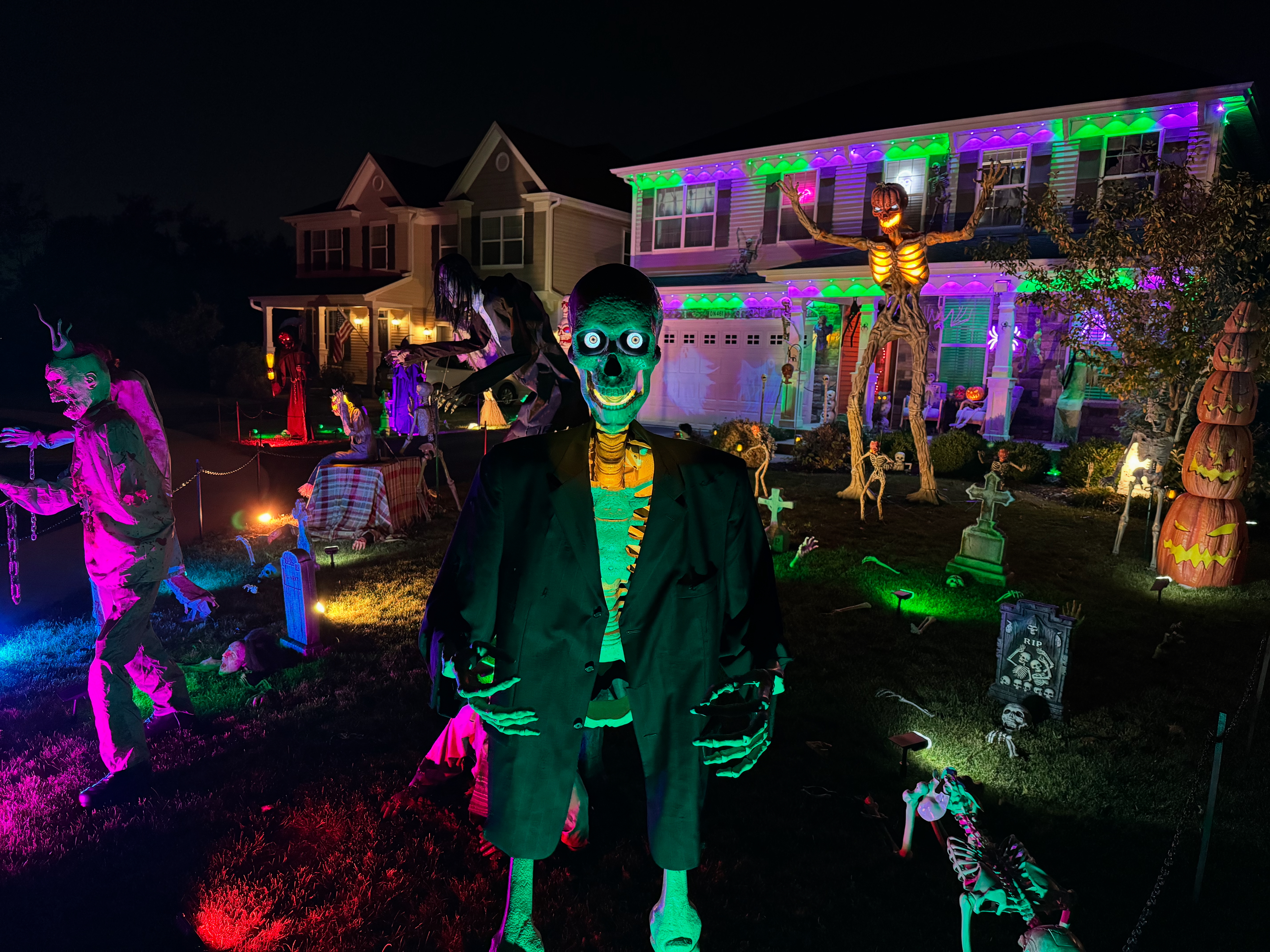 This family-friendly display is down the street from the Stranger Things display and has great scenes with pumpkins, skeletons, and fog. They are so talented, they help create props for other displays as well!