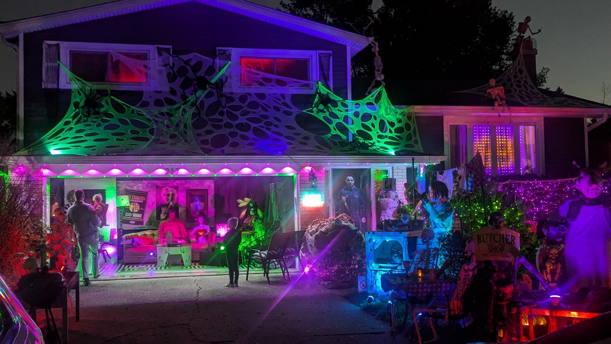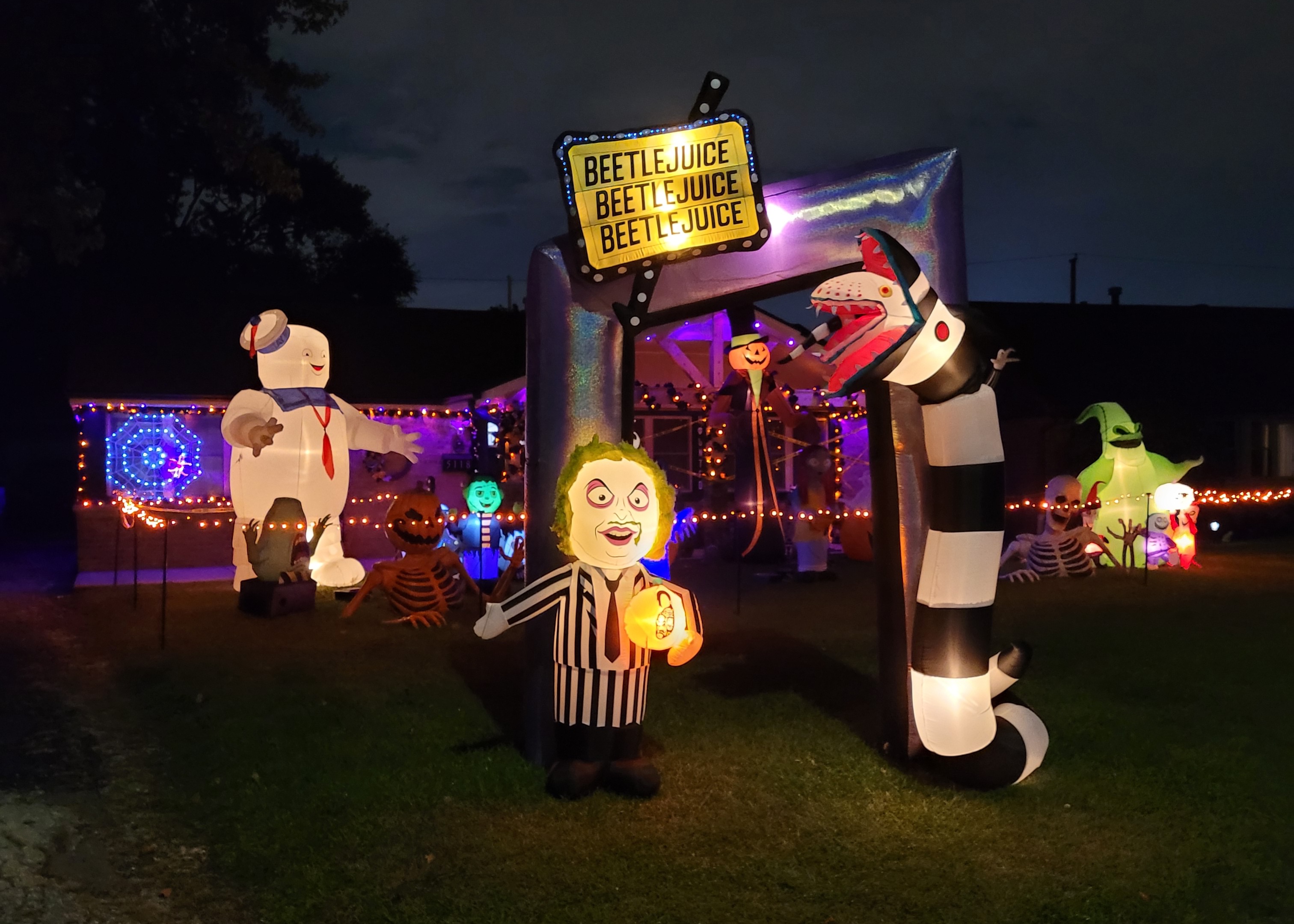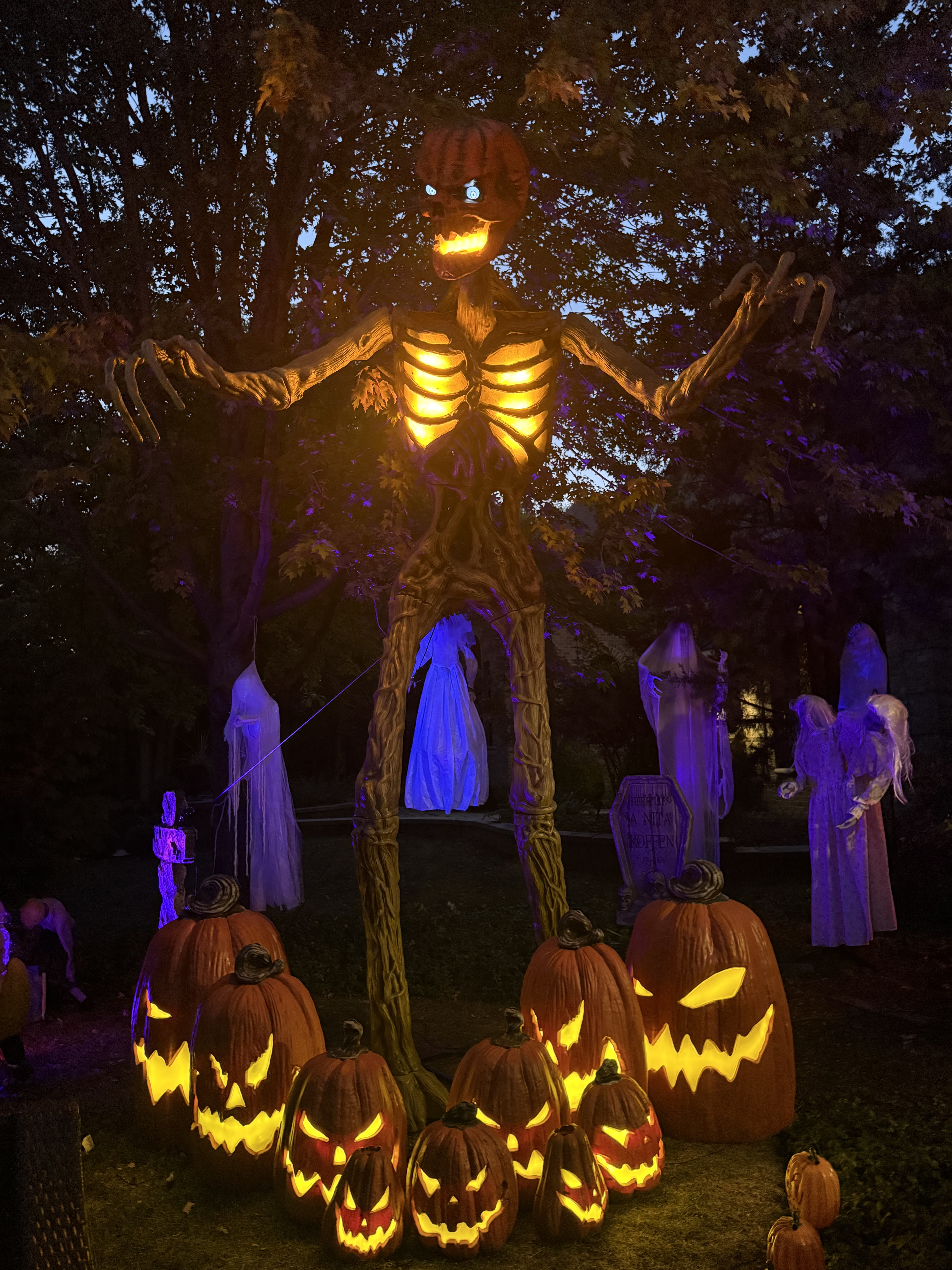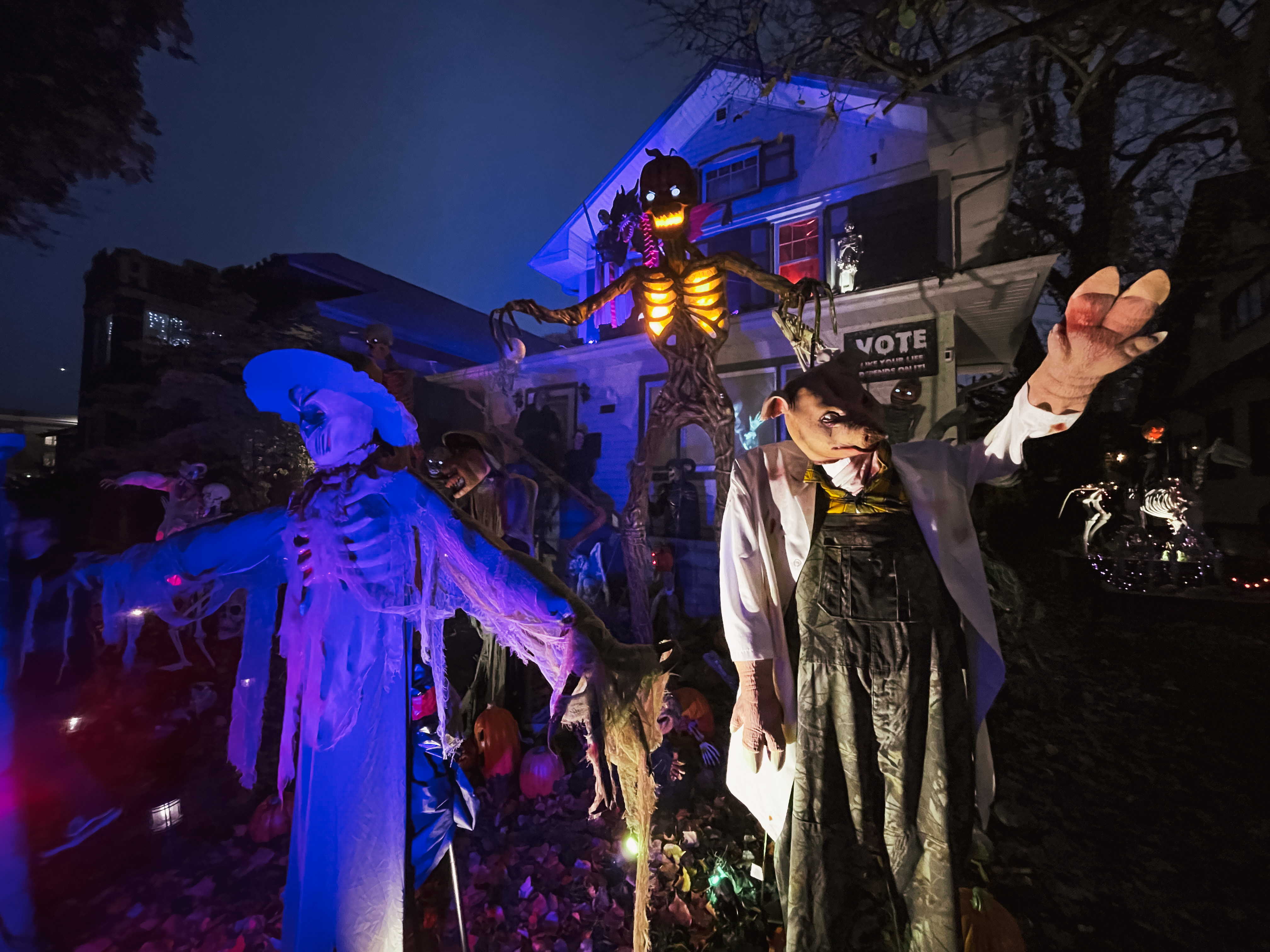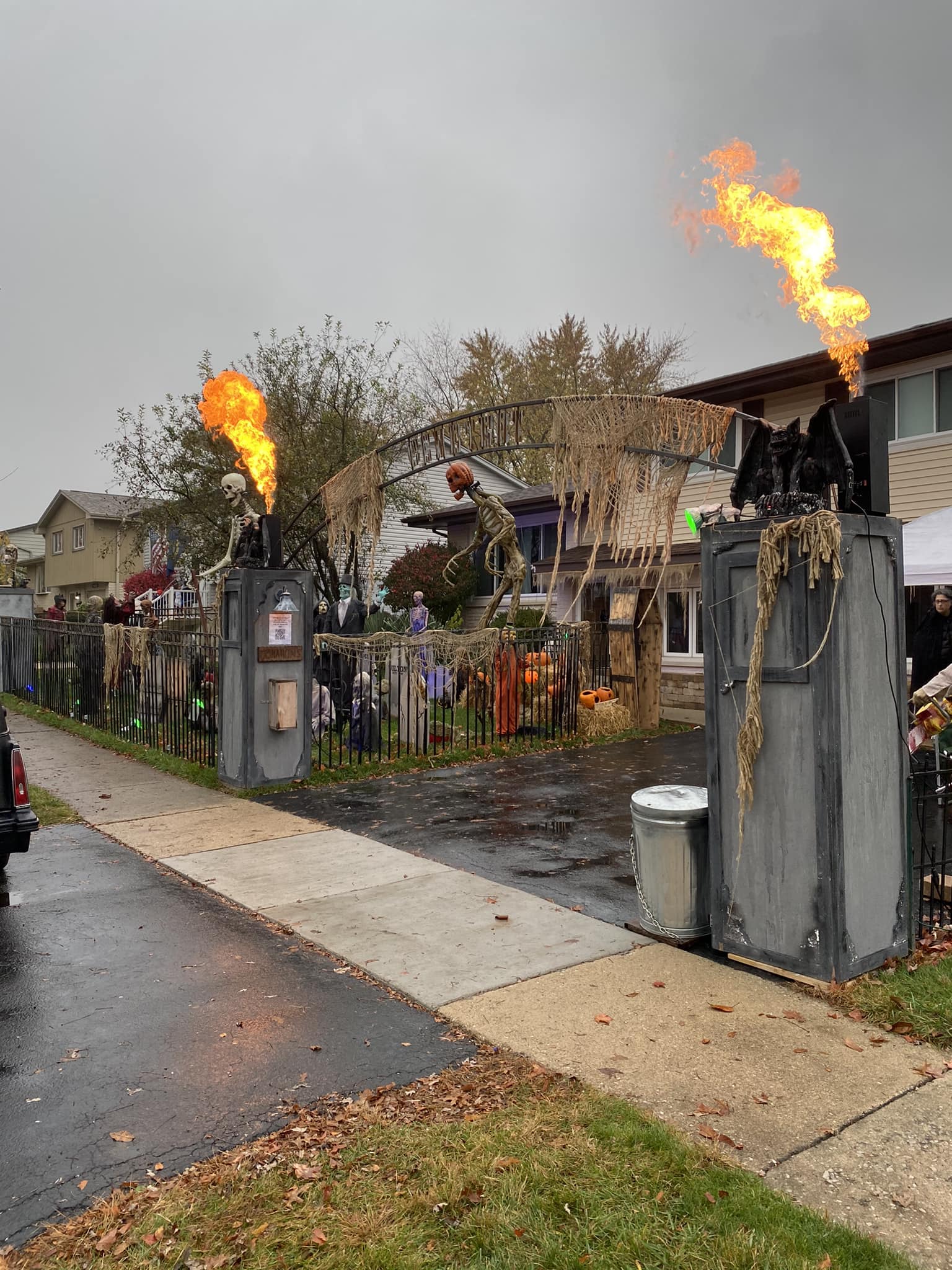 This family-friendly display is down the street from the Stranger Things display and has great scenes with pumpkins, skeletons, and fog. They are so talented, they help create props for other displays as well!