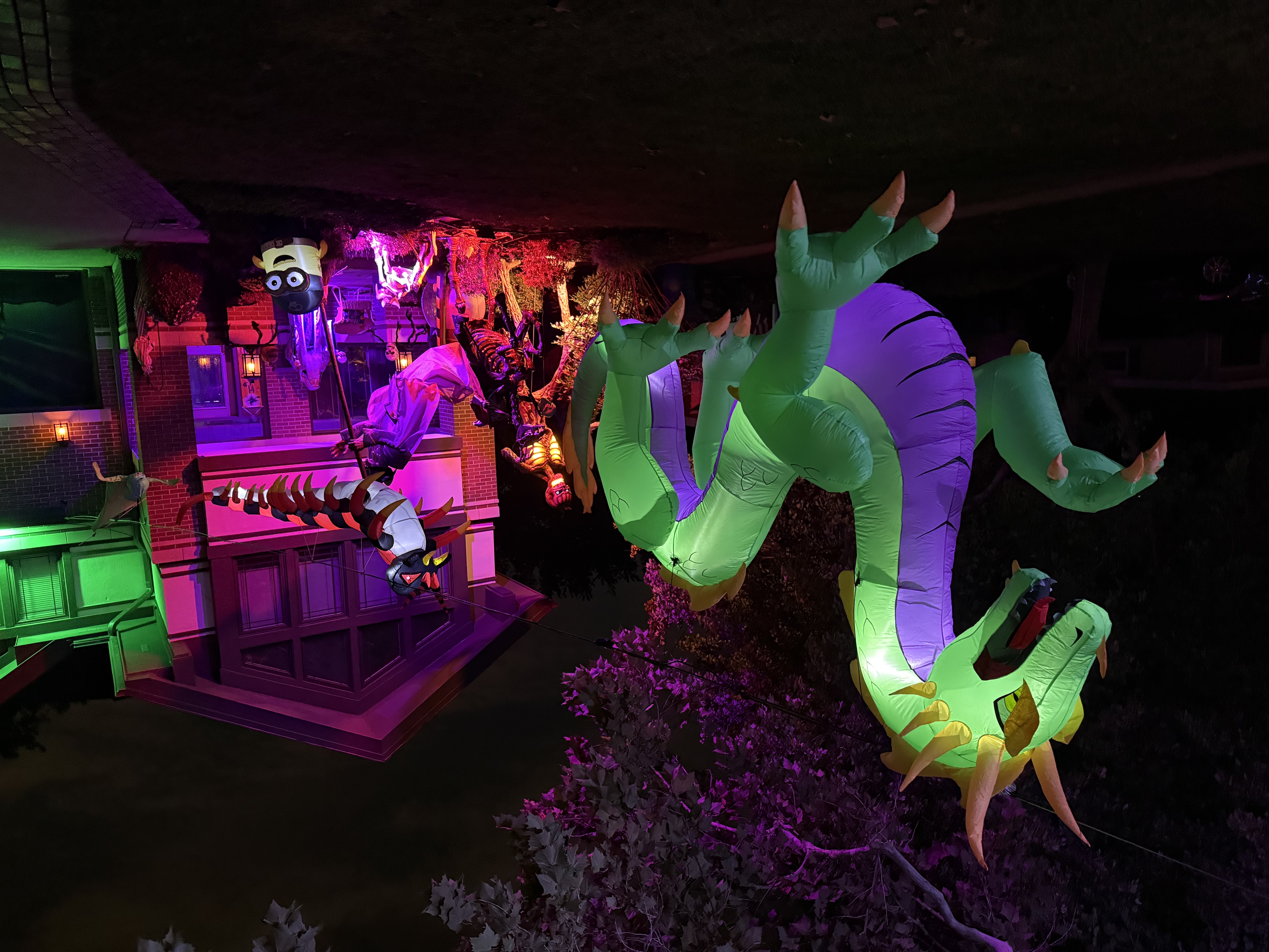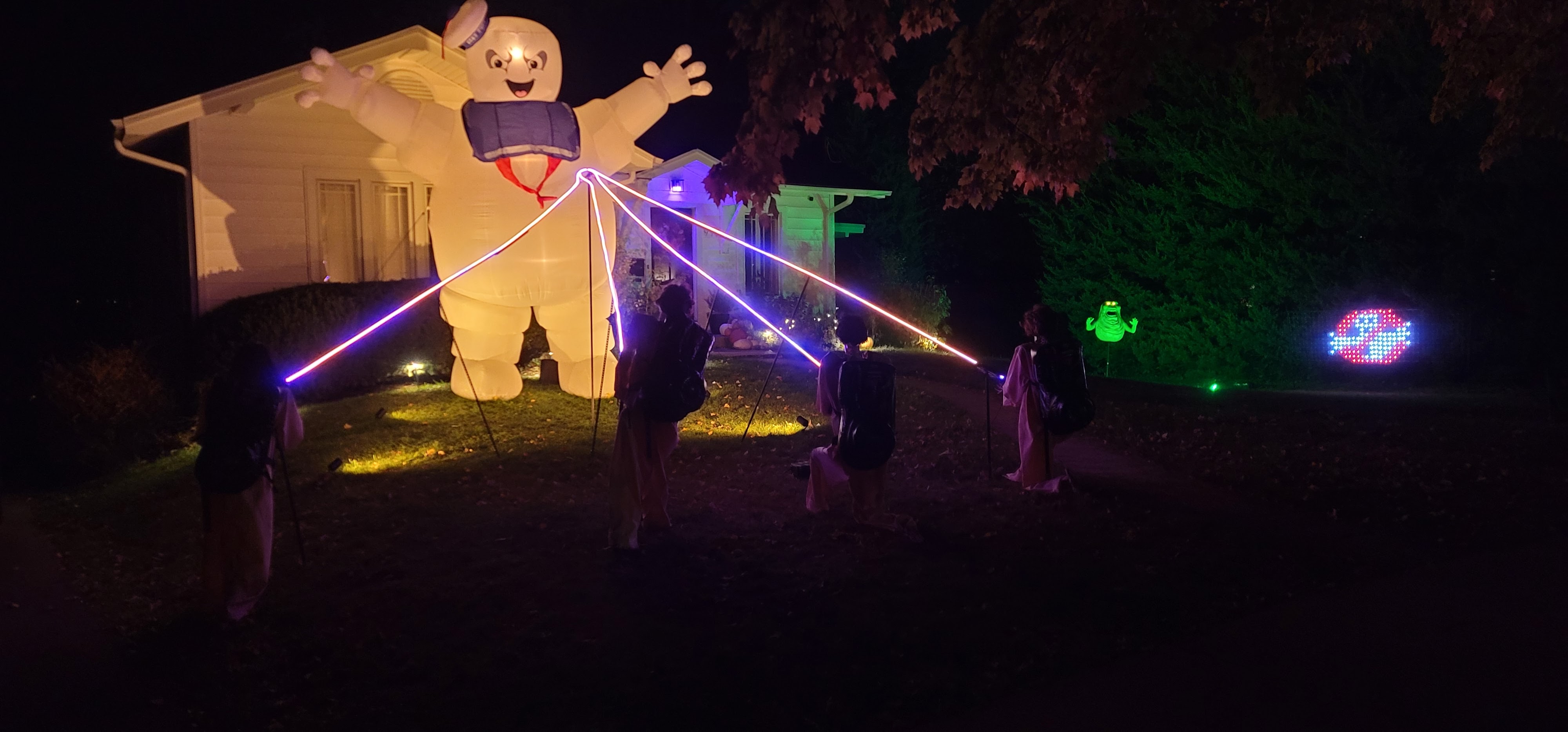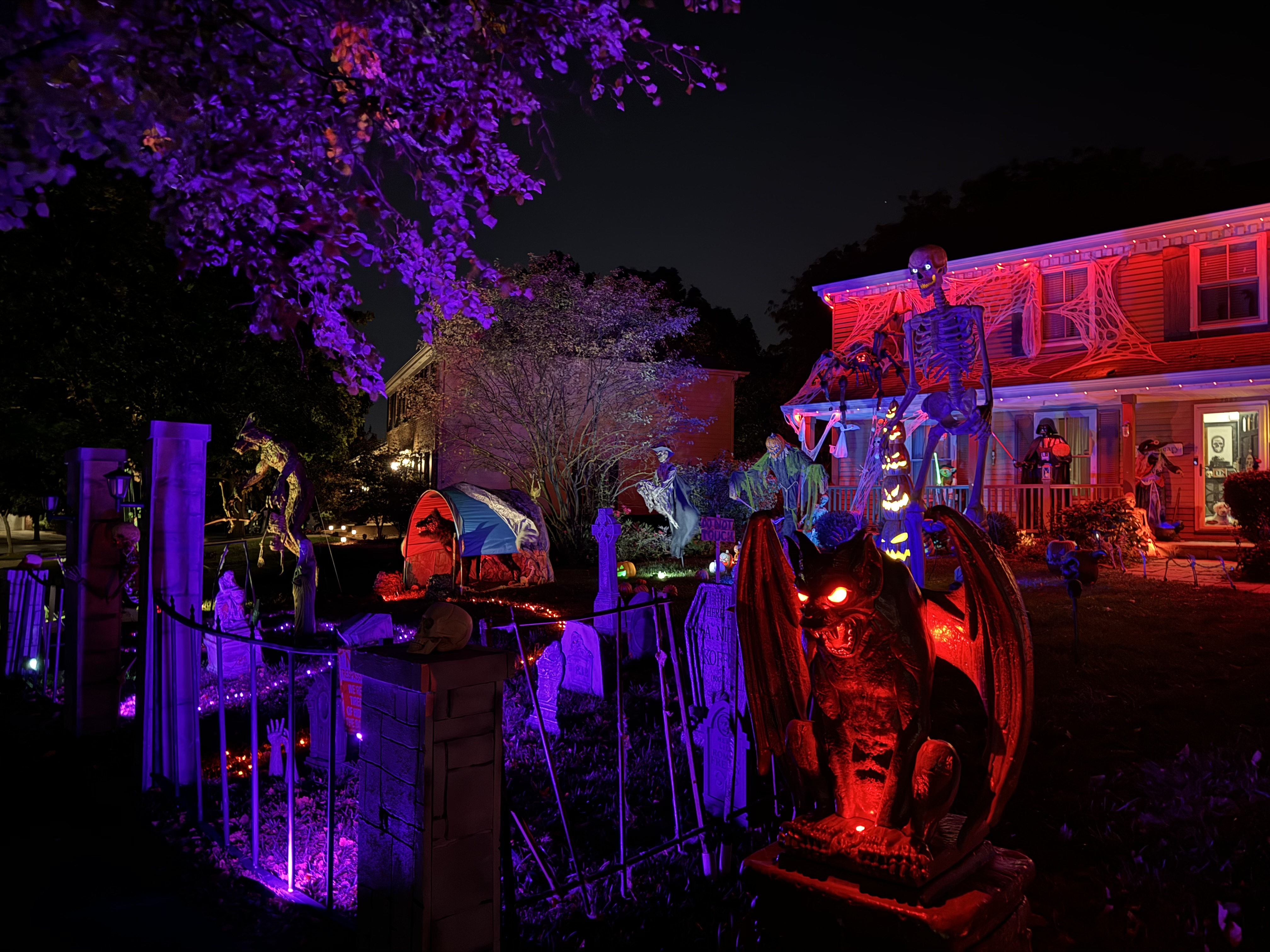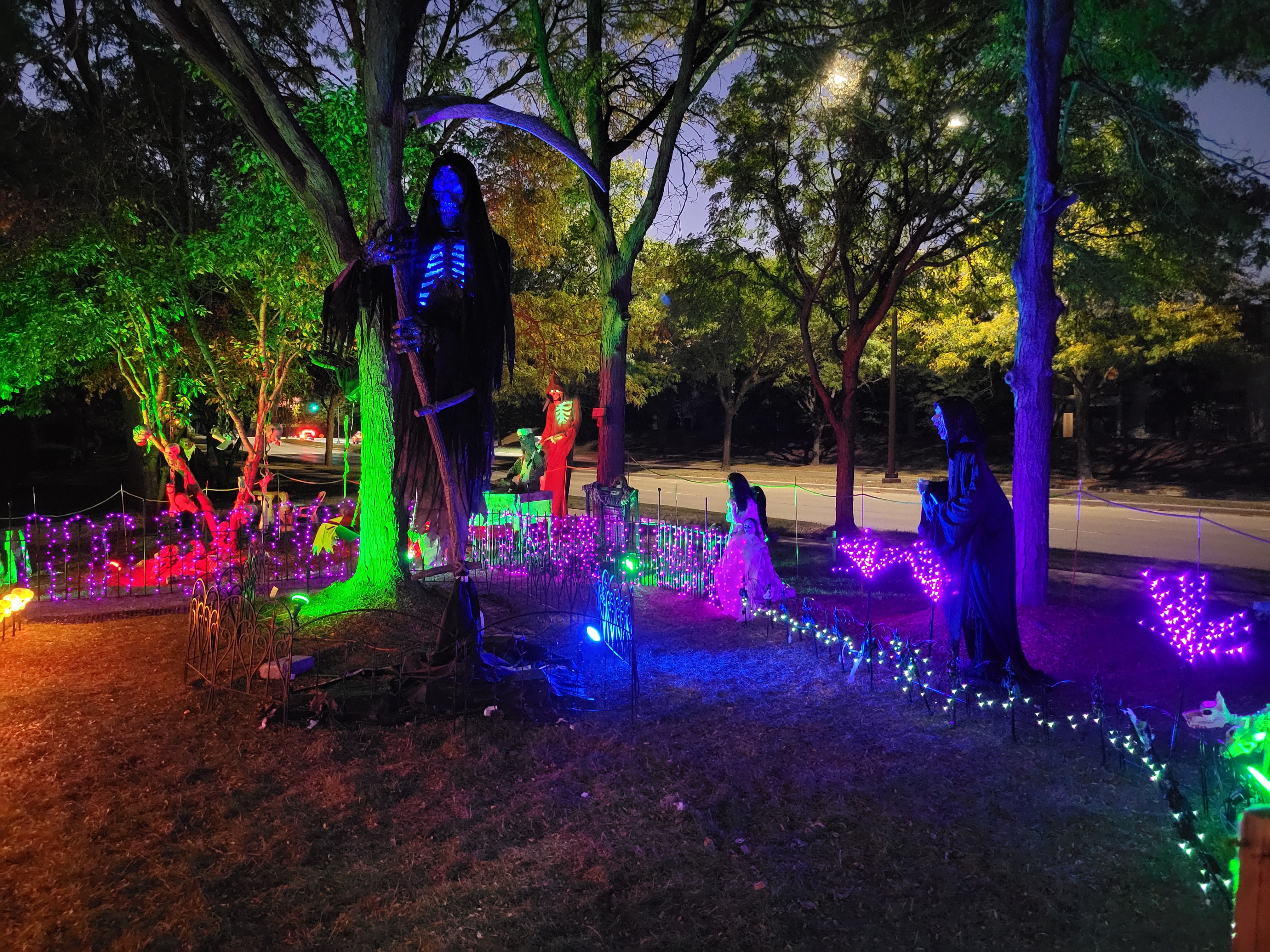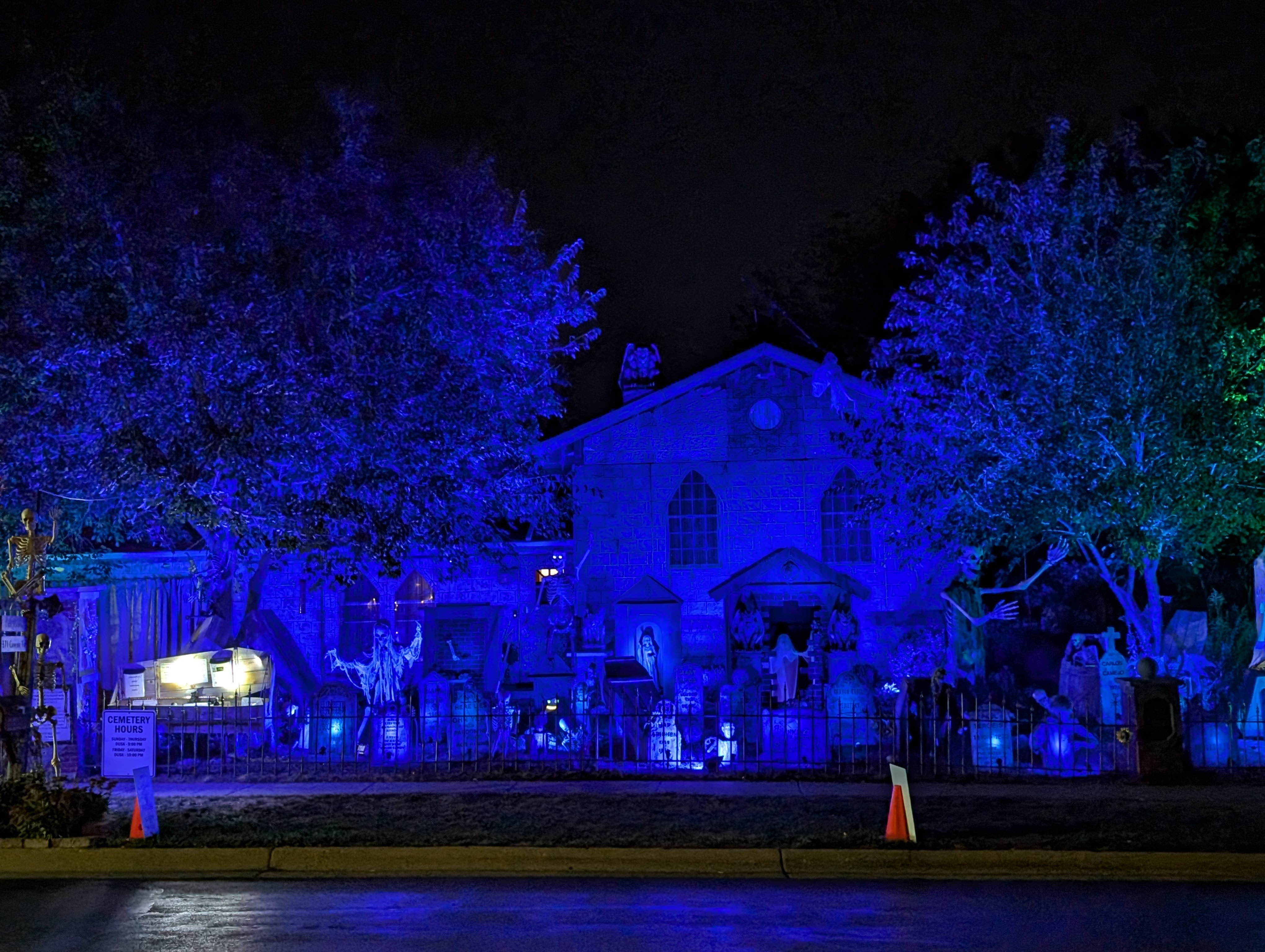 This family-friendly display is down the street from the Stranger Things display and has great scenes with pumpkins, skeletons, and fog. They are so talented, they help create props for other displays as well!