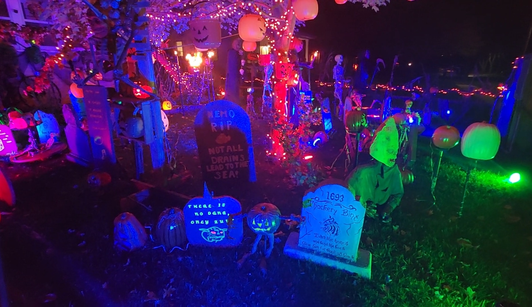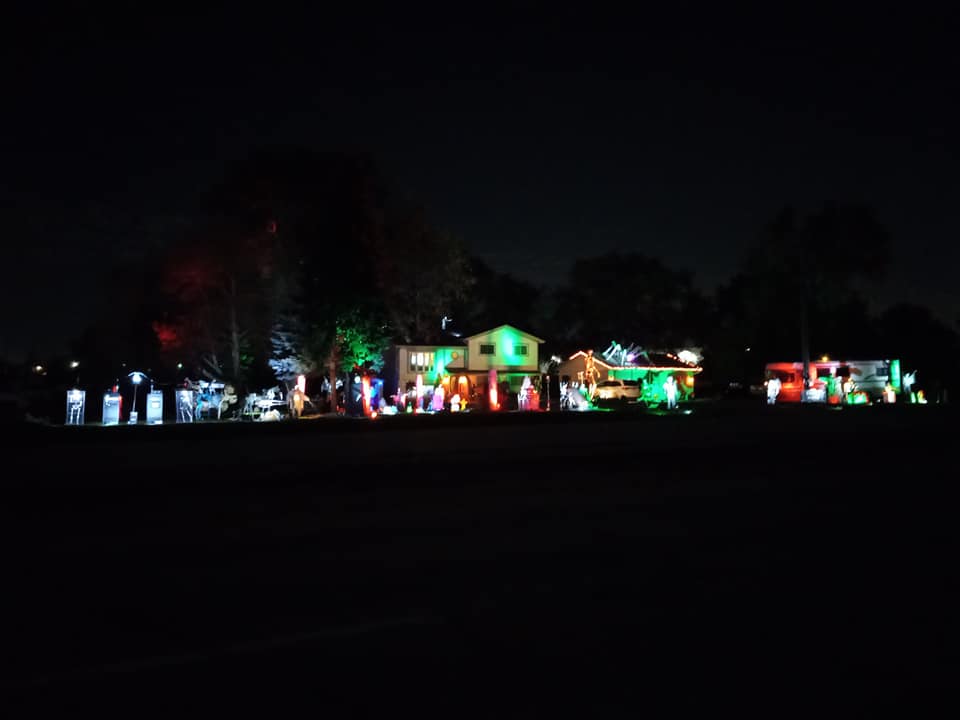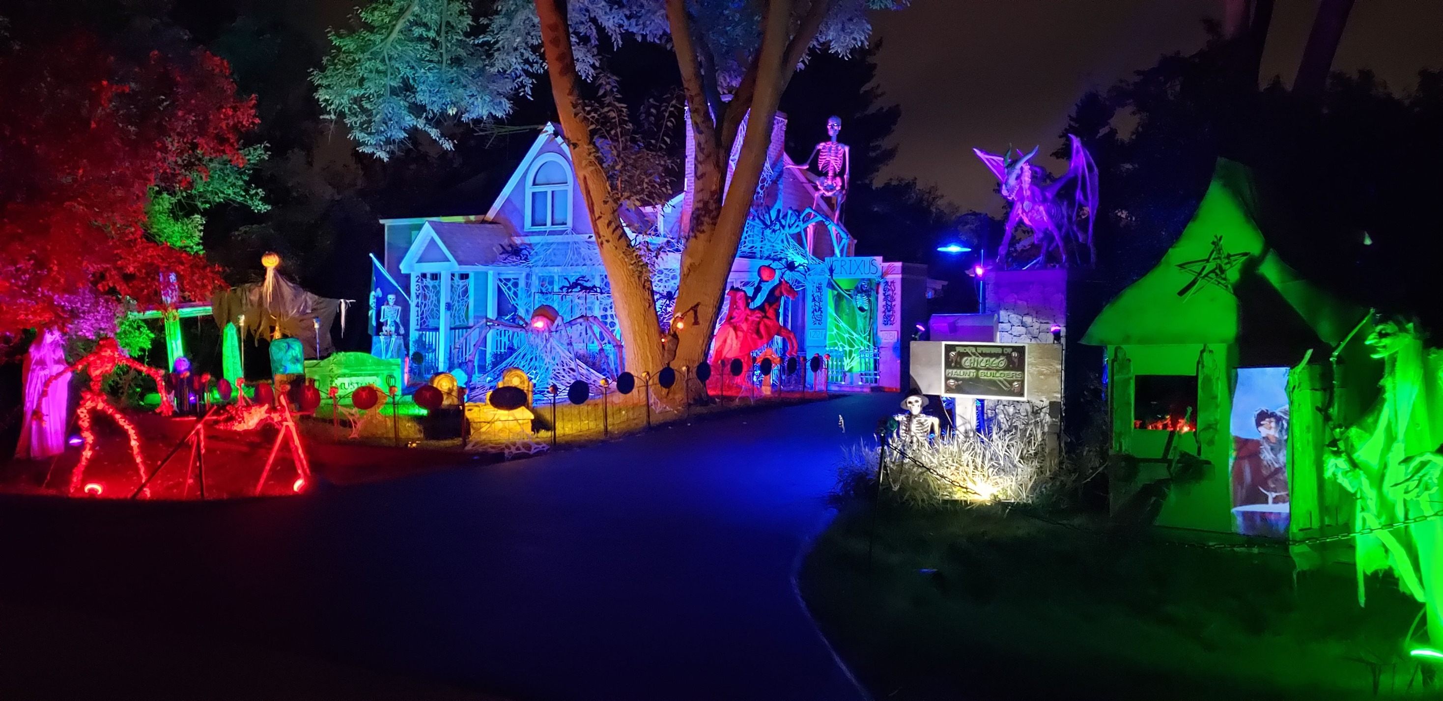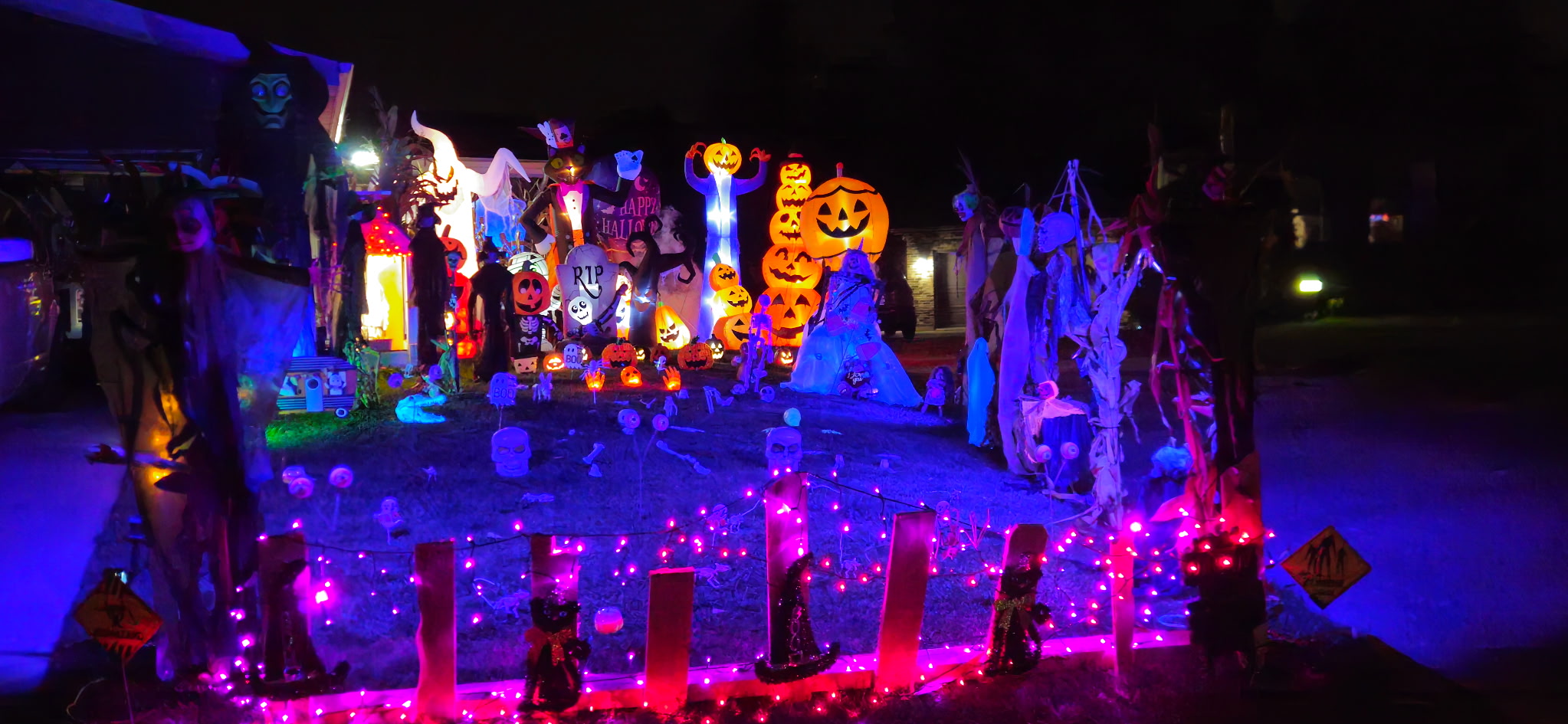 Returning mid-October 2025 and every night (weather permitting) from dark until 10:30pm, 11:30pm on weekends. This family creates multiple scenes every year for Halloween and Christmas. The homeowner creates 3D video-projected displays set to music, including singing pumpkins. The audio is broadcast over FM radio so people can watch from the safety and comfort of their car. To keep things fresh, he adds news scenes throughout the month leading up to Halloween! This year is a new "Headless Horseman" theme from the Disney movie and te "Oogie Boogie" song from "A Nightmare Before Christmas". The homeowners will be raising money in support of their daughter’s neurological disorder, called misophonia. When you are at their home, they have a text to donate option.