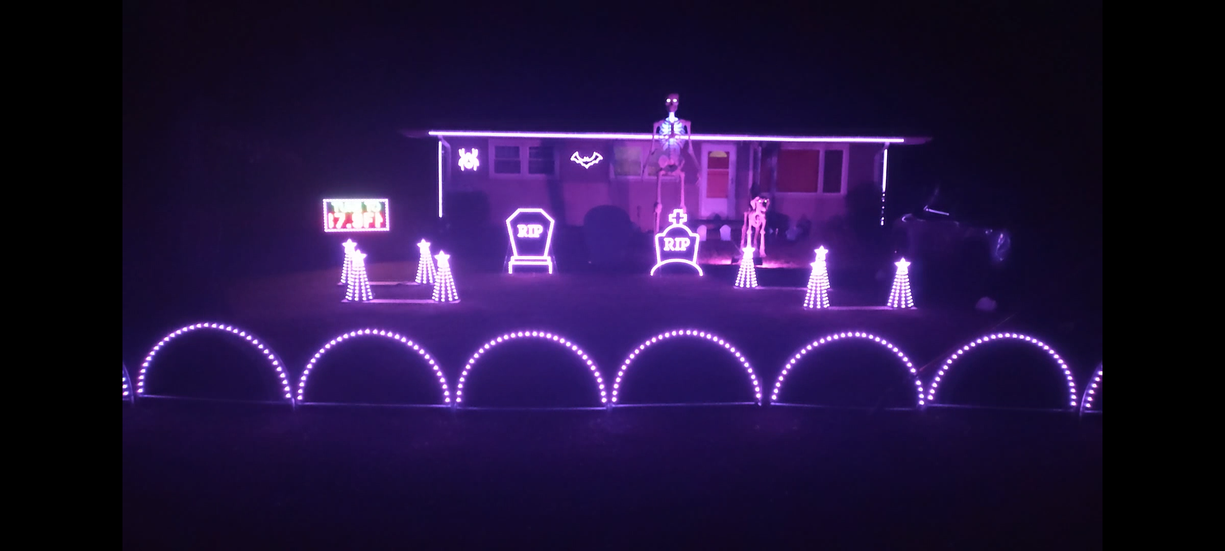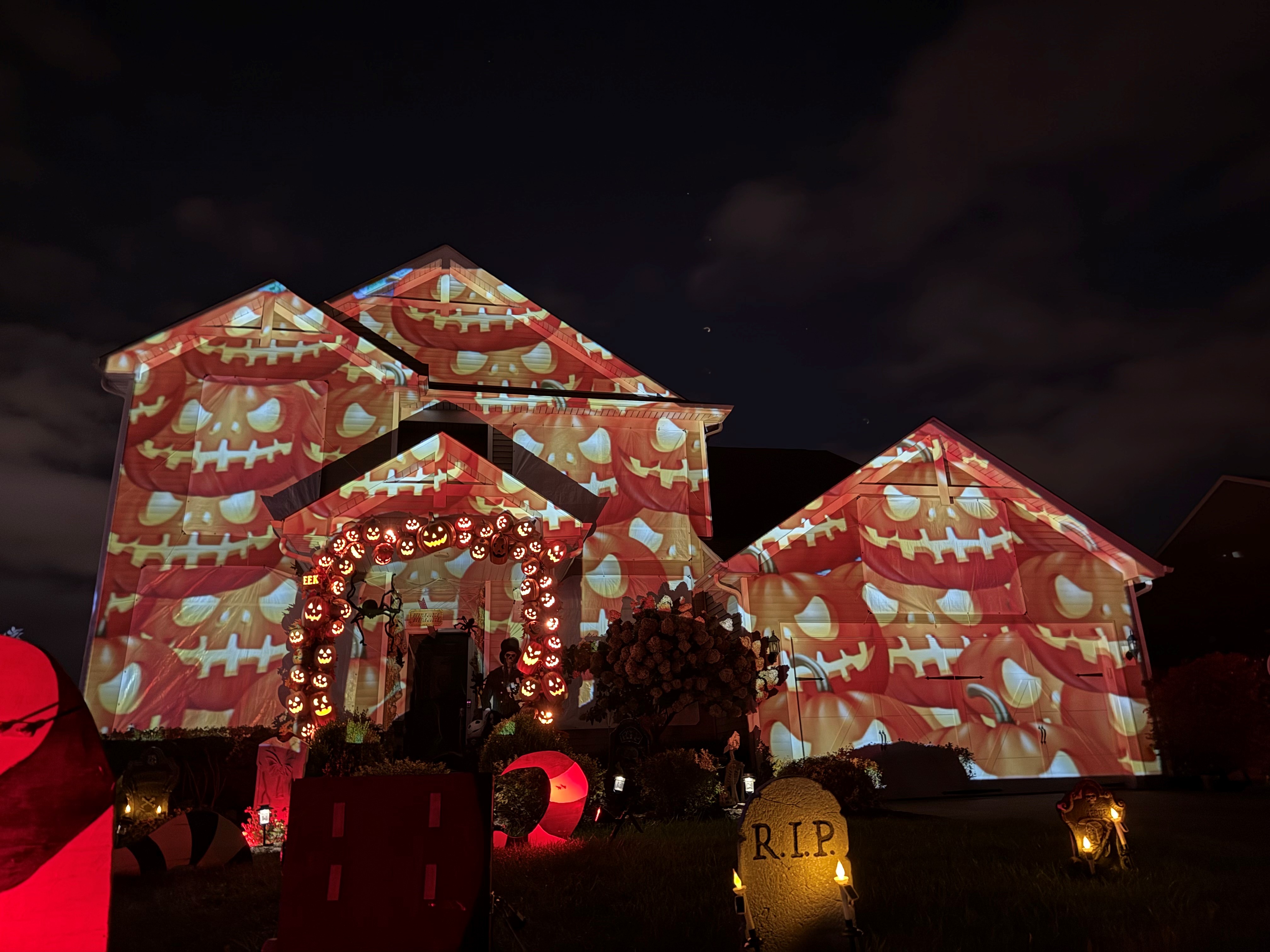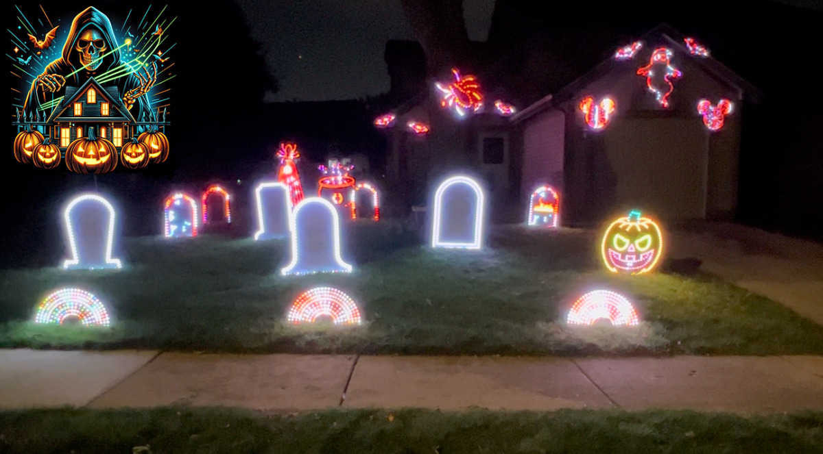 Returning mid-October 2025 and every night (weather permitting) from dark until 10:30pm, 11:30pm on weekends. This family creates multiple scenes every year for Halloween and Christmas. The homeowner creates 3D video-projected displays set to music, including singing pumpkins. The audio is broadcast over FM radio so people can watch from the safety and comfort of their car. To keep things fresh, he adds news scenes throughout the month leading up to Halloween! This year is a new "Headless Horseman" theme from the Disney movie and te "Oogie Boogie" song from "A Nightmare Before Christmas". The homeowners will be raising money in support of their daughter’s neurological disorder, called misophonia. When you are at their home, they have a text to donate option.