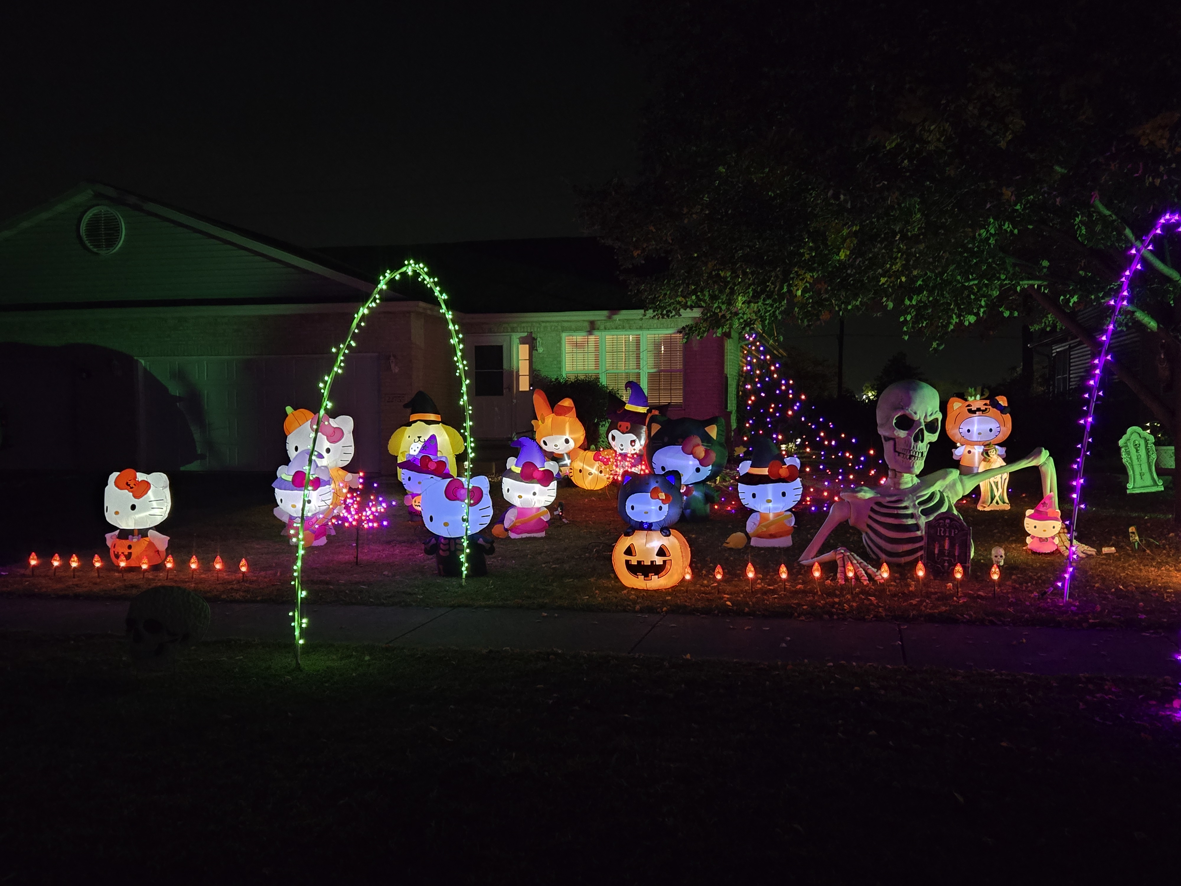 Four yards decorated for Halloween! The main theme in one yard is 13 inflatable Hello Kittys! Lighted arches over sidewalk, spider web tunnel, vintage blowmolds, groundbreaker skeleton. Kid friendly.
