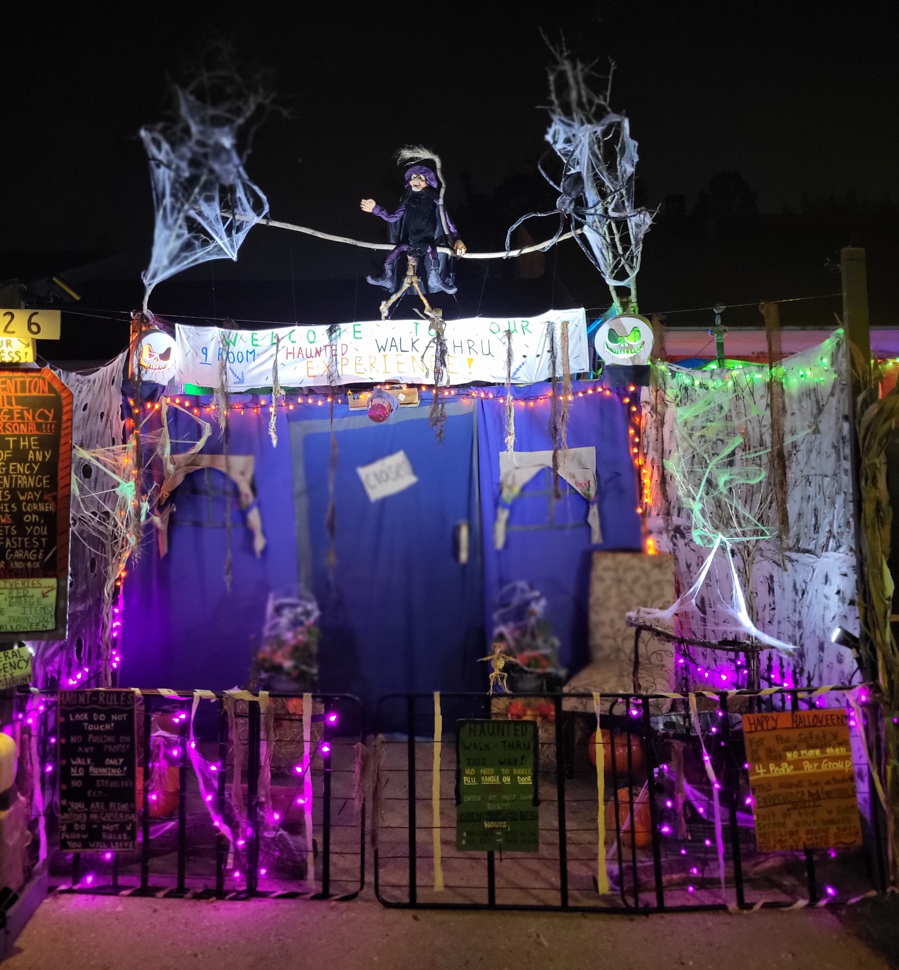 Walk through the front and back yard of this haunted house. You'll see many animated characters, but nothing live to “spook” the younger visitors. Their creatures and tombstones are hand made! Please note that the display is closed if raining. We’ve been haunting for over 20 years and have over 1000 visitors every season.