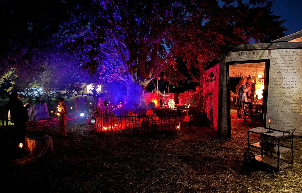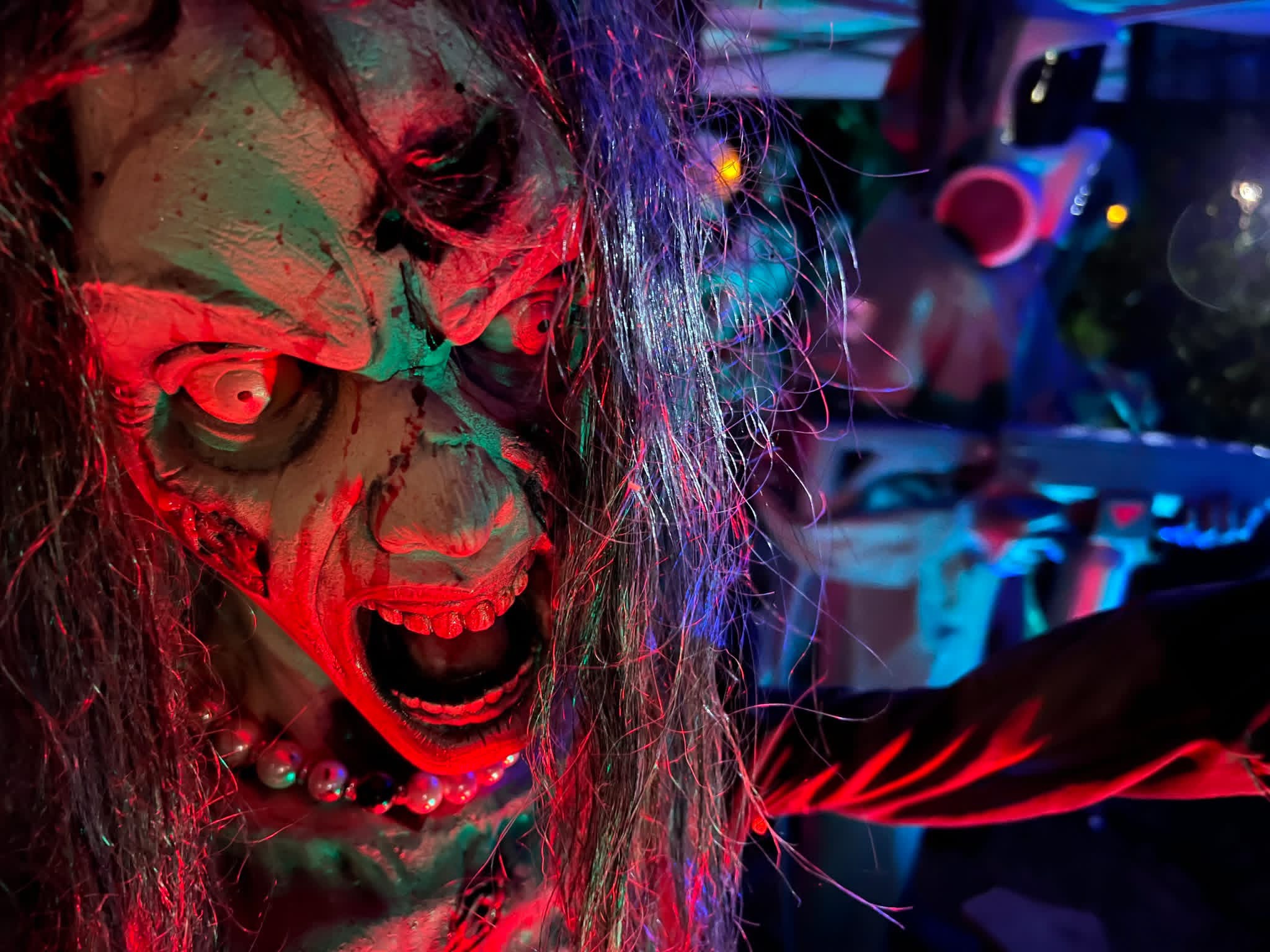 Riverwalk Haunted Cemetery rises from the shadows with skeletons crawling from the ground, eerie lights, fog, and thrilling motorized props. Beware of jump scares and stop for spooky photo ops—an unforgettable Halloween experience!