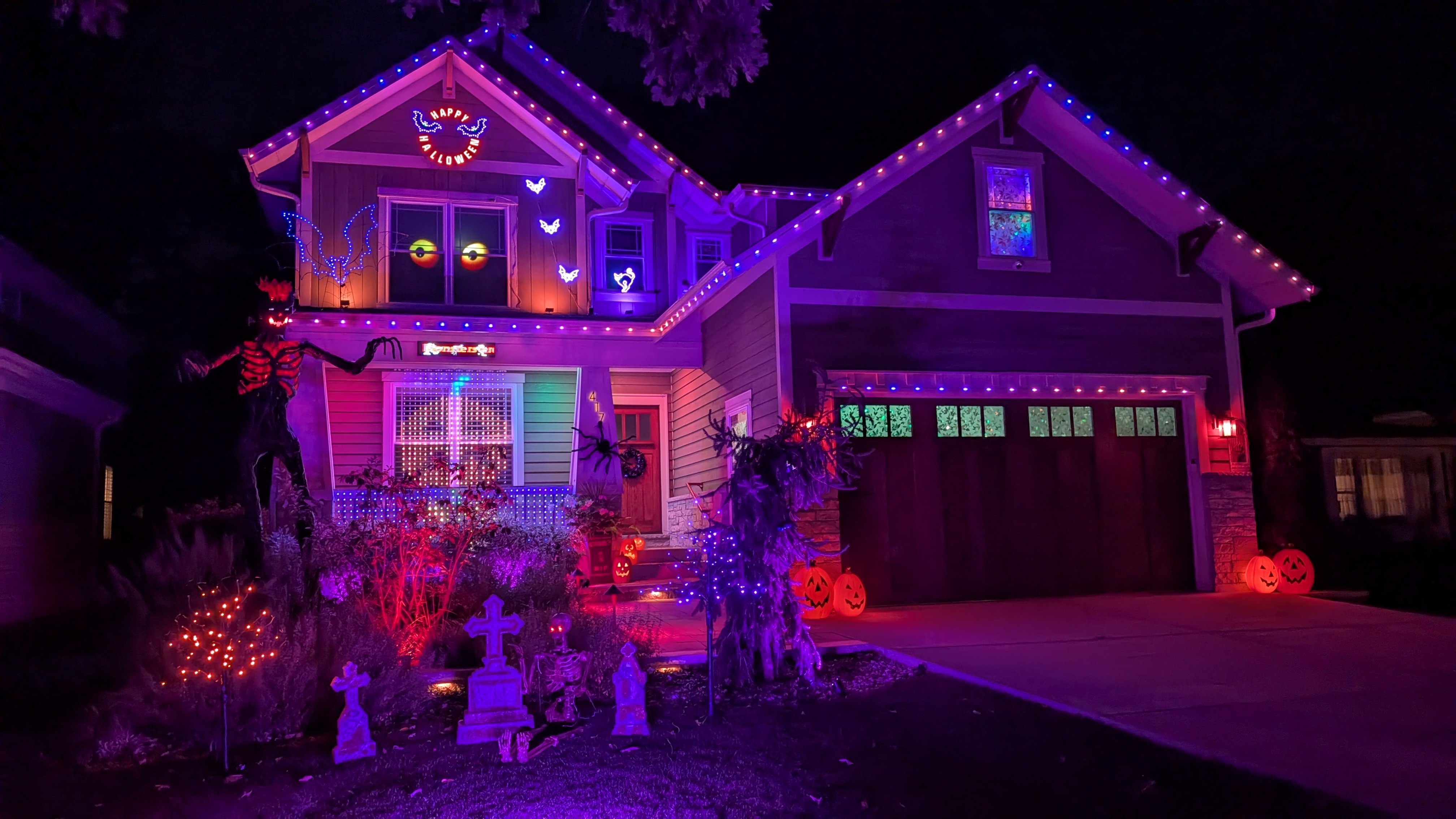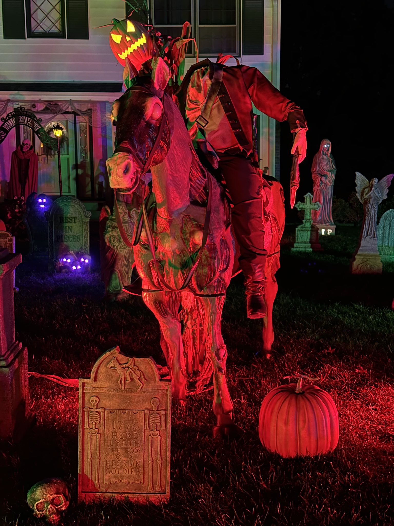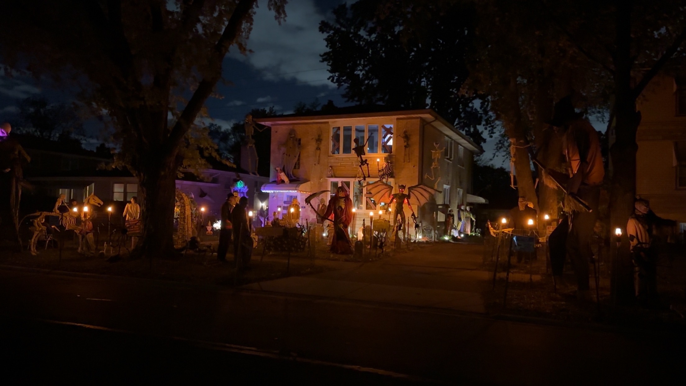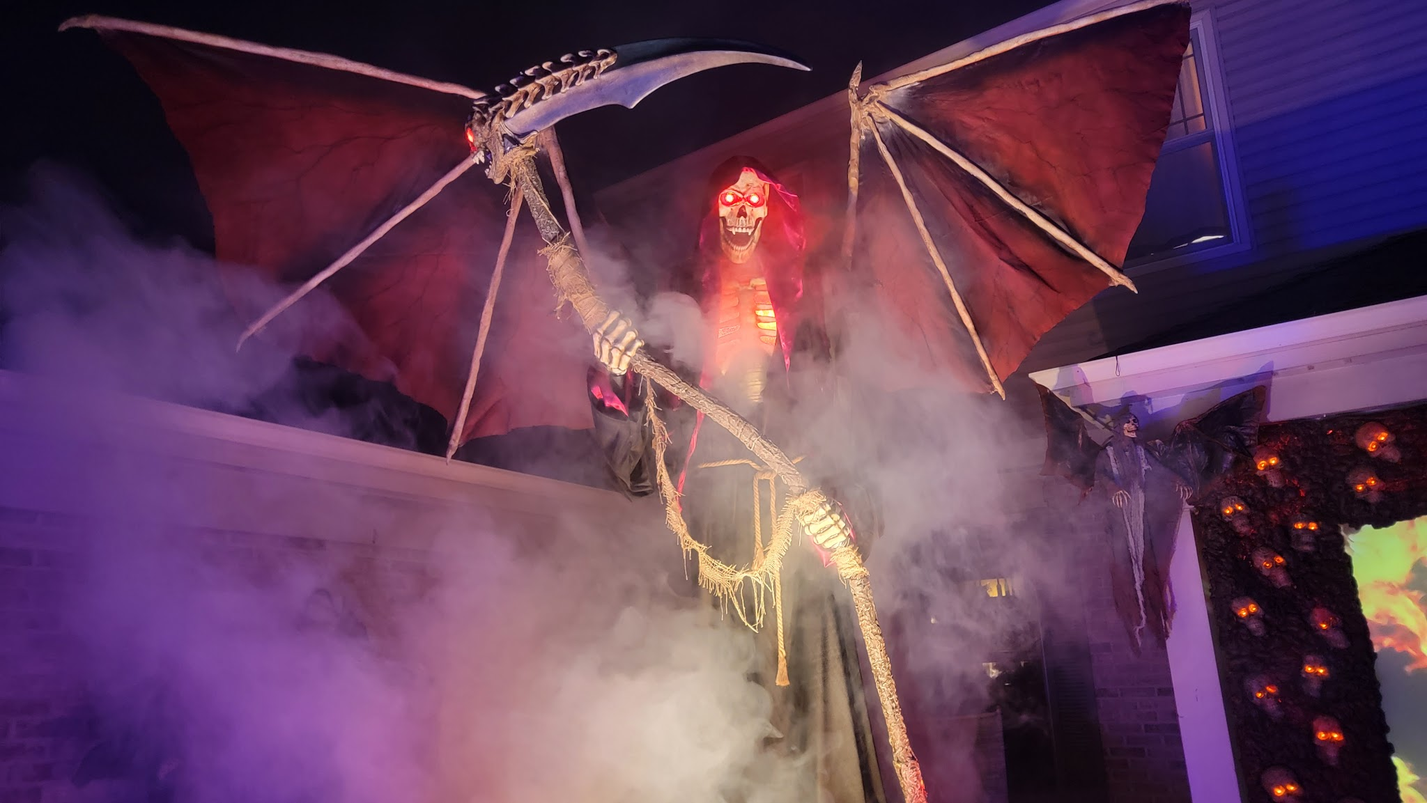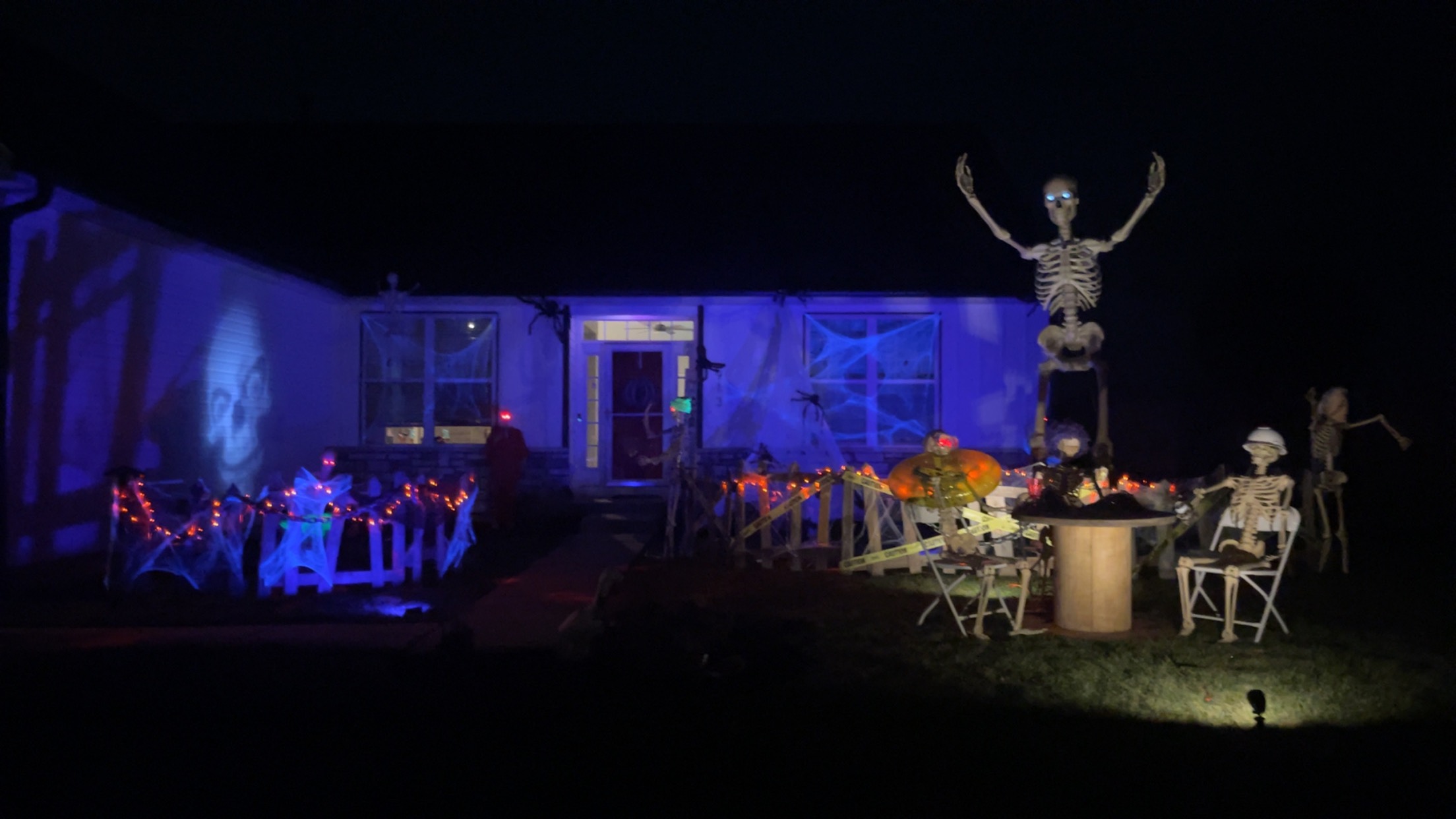 From 2024: This family has an unusual guest lurking over their house waiting for passerby. Check out their graveyard and spooky friends!