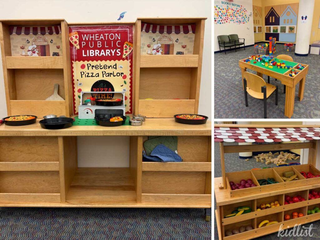 The Wheaton Public Library is nestled right between downtown Wheaton and the Wheaton College campus. Located on the lower level, the youth department boasts activities including LEGO tables, toddler wall play activity boards, various block areas, pretend play area complete with pizza kitchen and produce market. There are also comfy chairs to curl up on and read.