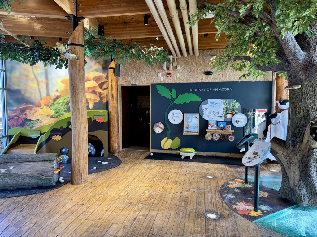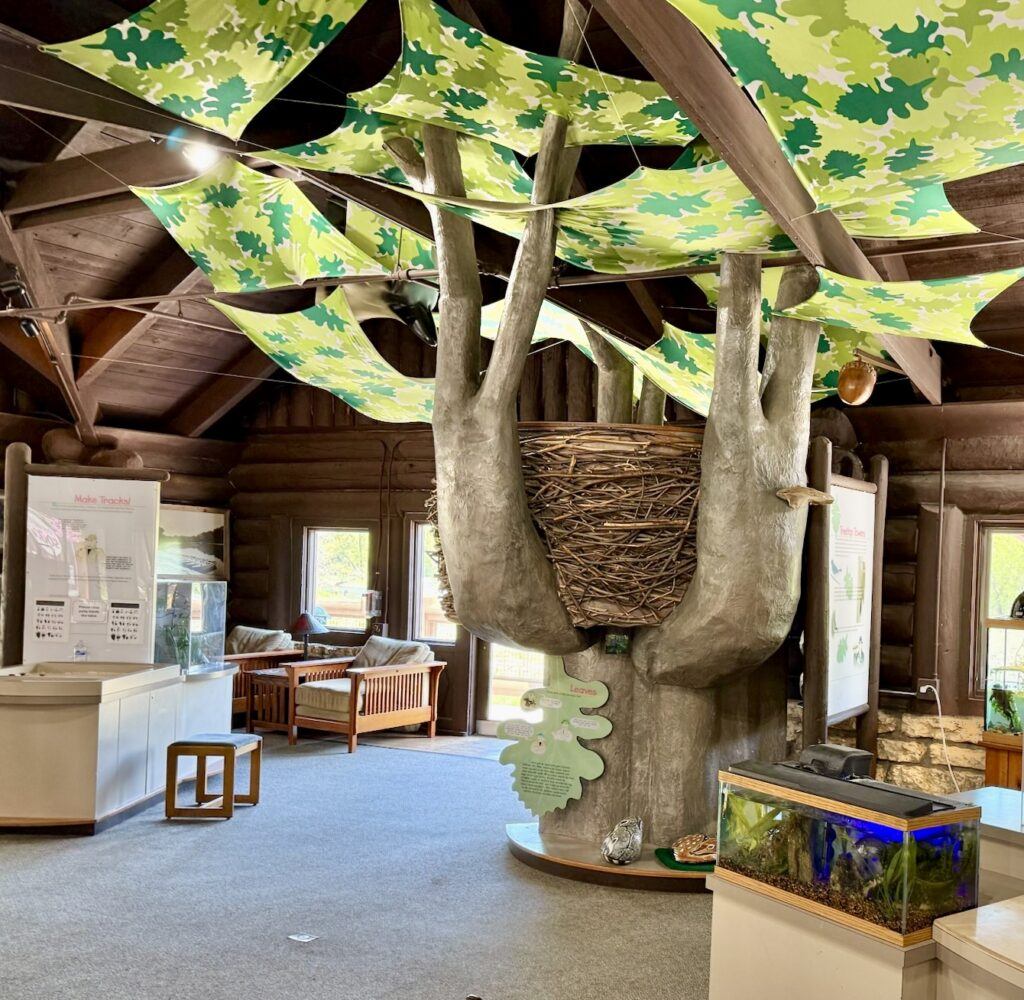 Hidden Oaks Nature Center was beautifully renovated in 2025 and features a variety of hands-on exhibits, rotating seasonal displays, and play spaces kids will love. Right when you enter, you’ll find a large interactive oak tree where children can spot animals and insects, along with a soft play area complete with a slide that is always a hit with my toddler!