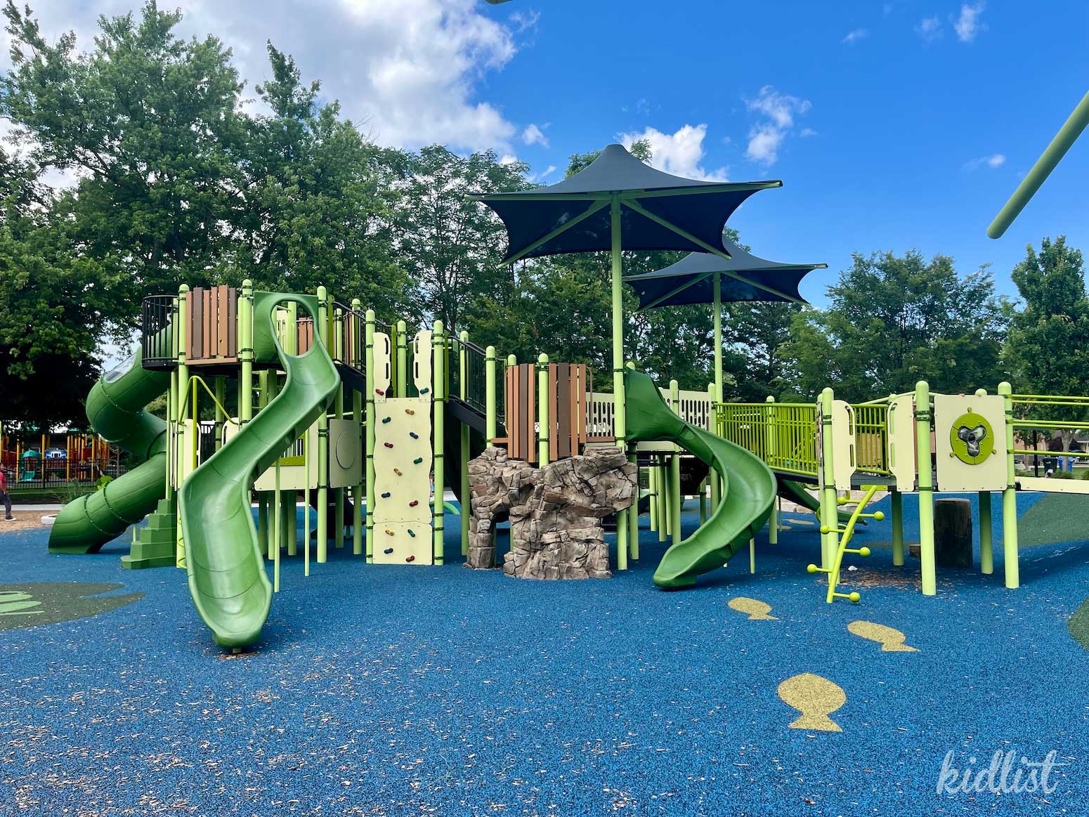 A whimsical storybook theme, gated splash pad, and shared parking lot with the 95th Street branch of the Naperville Public Library make this playground a local destination. The soft, rubbery play surface and low-to-the-ground climbing structures are great for tots, while older kids will enjoy twisty climbers and taller slides.