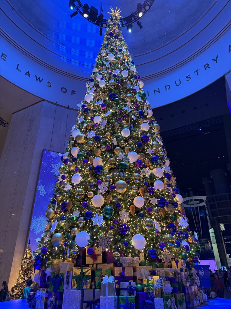 Riding up the escalators to the main level, your eyes are immediately drawn to the rotunda. At the center of the rotunda is the Great Tree, which stands over four-stories and makes for a picturesque holiday backdrop. Every 30 minutes, a snowfall simulation goes off, dropping “snow” down on viewers in the rotunda.
