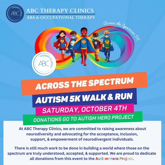 ABC’s Across the Spectrum 5K was created by ABC Therapy Clinics, a local family owned ABA clinic committed to providing therapy services to children with autism. This event is designed to bring together people of all ages to participate in a day full of fun, fitness, and awareness.