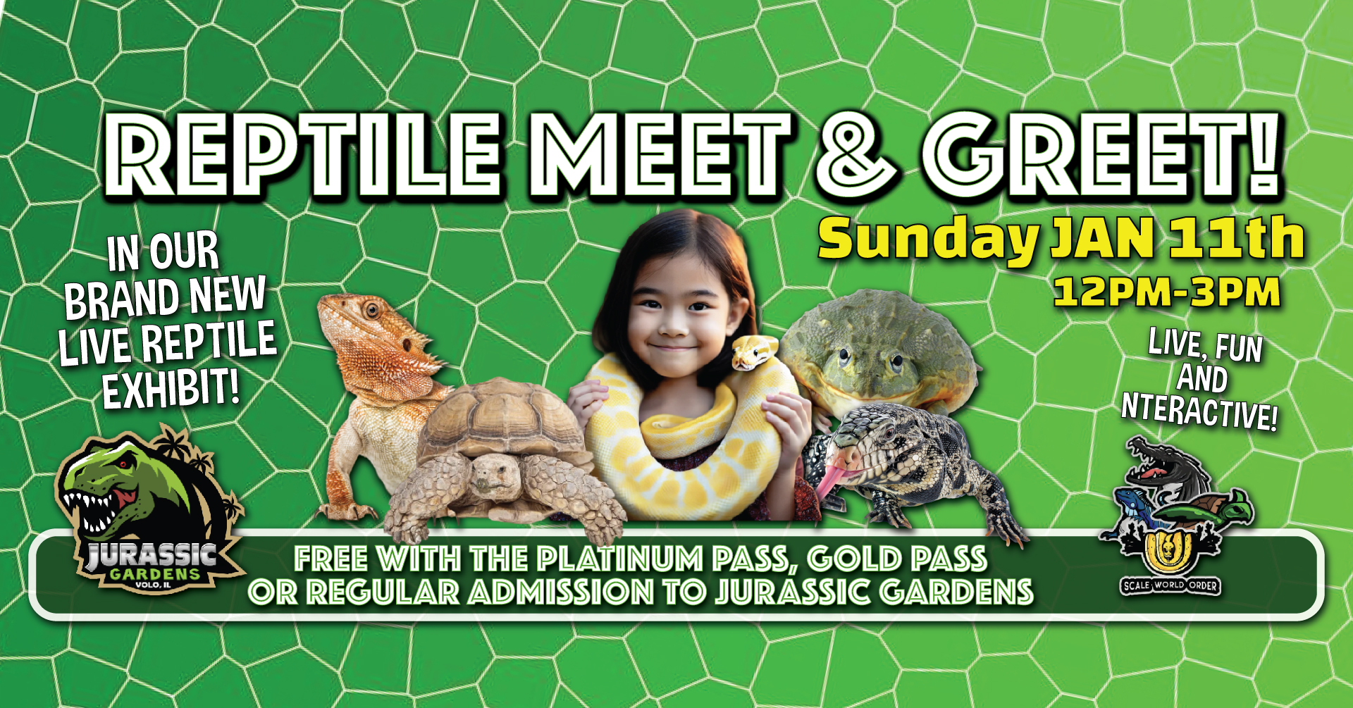 Every 2nd Sunday of the month, inside of the brand new, permanent, live reptile exhibit at Jurassic Gardens, our friends from Scale World Order will be performing an interactive, educational and entertaining reptile meet and greet!