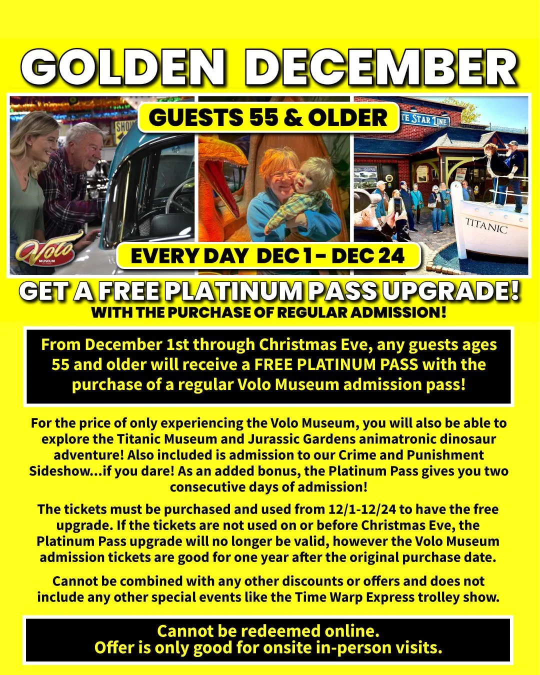 Visitors ages 55 and older will receive a FREE Platinum Pass upgrade.