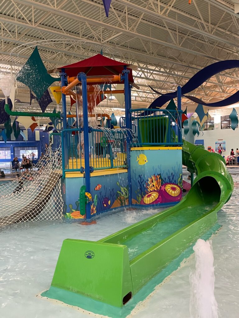Year round indoor pool facility with zero-depth leisure pool, mini lazy river, interactive water play structures, four-lane lap pool, and toddler slide. Check the pool schedule before heading out. Day passes, memberships and party packages are all available.