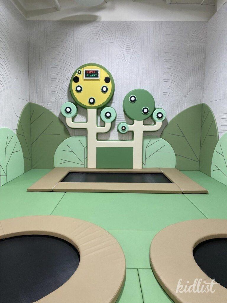 Small trampolines with interactive activity wall for younger visitors.
