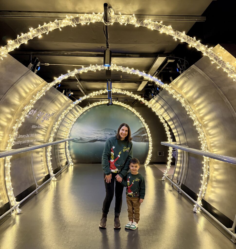 Our first stop was the Chicago museum which was added to the lower-level of the Skydeck in Spring 2021. The museum celebrates the history, neighborhoods and sites of Chicago. Explore the exhibits within the museum to learn about the Great Chicago Fire, the city during its formative years, architecture, and more. The museum is filled with fun photo ops that are decorated for the holidays and celebrate different elements of the city like the Taste of Chicago, Second City stage, Wrigley Field, Cloud Gate (the bean), and Chicago’s art installments. We really enjoyed the full-scale replica “L” train that is decked out for the holidays.