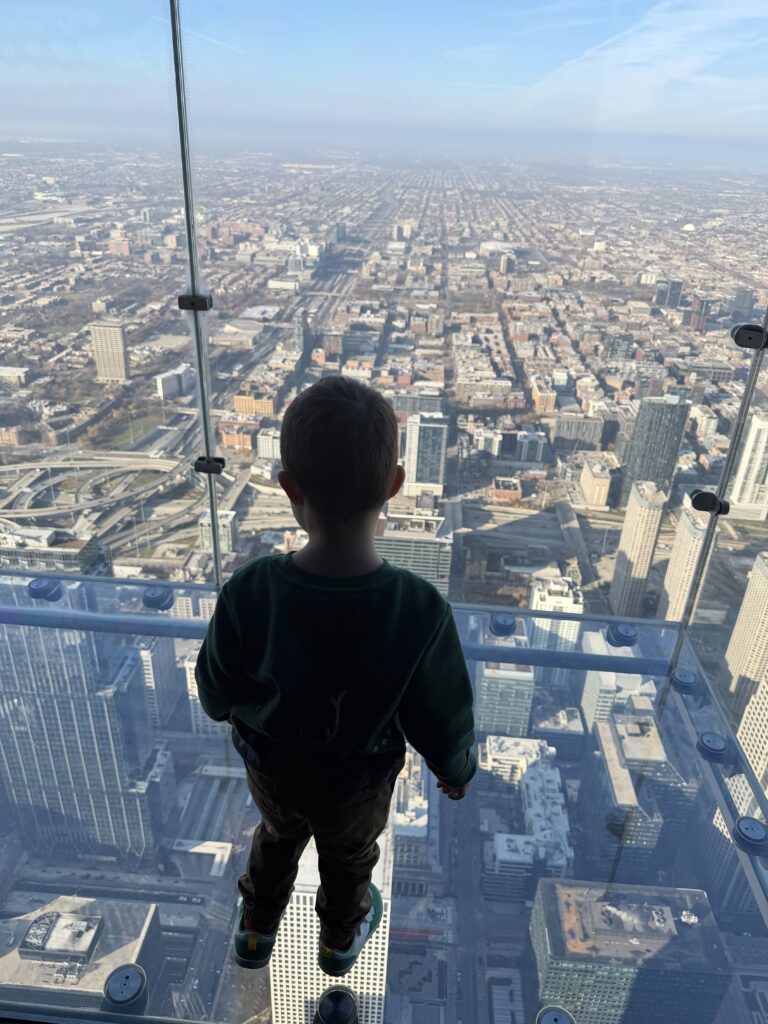 Our final stop was to visit the Ledge. The Ledge is five glass floor balconies extending 4.3 feet out from the Willis Tower, each made of three layers of half-inch thick glass laminated into a seamless unit. I will admit that we were a little nervous to step out onto the Ledge, but the view is breathtaking. Watching the city in motion below your feet is such a unique experience.
